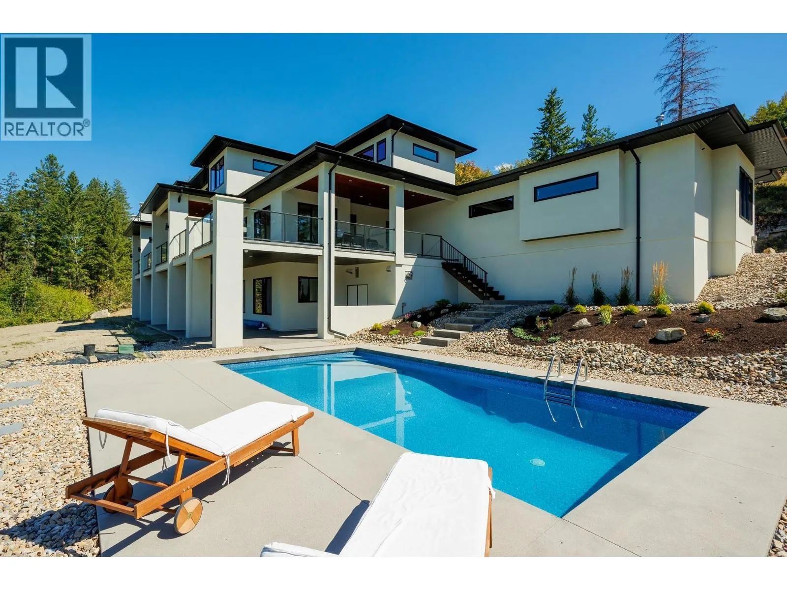 +"PublicRemarks": "Welcome to 4451 Hayes Rd. – Modern Luxury Meets Okanagan Living! Set on 4.9 gated acres in one of Kelowna’s most prestigious enclaves, this ~6,500 sq. ft. architectural estate captures panoramic views of the lake, city, and mountains. Inside, 24’ ceilings, dramatic floating stairs, and walls of glass create light-filled living. With 7 bedrooms and 5 bathrooms, the home blends everyday luxury with space for grand entertaining. *Gourmet Living A chef-inspired kitchen with quartz counters, butler’s pantry, and hardwood floors flows seamlessly to a 1,300 sq. ft. deck—ideal for al fresco dining. The flexible lower level is roughed-in for a second kitchen, perfect for extended family or a private suite. *Smart & Sustainable Highlights include a 4-car garage with EV charging, dual furnaces, 3 HVAC zones, 2 A/C units, Sonos sound, whole-home data, air & water filtration, hot water recirculating pump, upgraded insulation, and a 32-panel solar farm for true net-zero living. *Resort Lifestyle Enjoy a 16x32 heated pool with auto cover, multiple outdoor lounges, and irrigated, low-maintenance landscaping. With carriage house zoning, this estate offers future opportunities for family, guests, or investment. *Built in 2019 by Custom Choice Builders, 4451 Hayes Rd. delivers the ultimate blend of modern design, sustainability, and luxury—just 10 minutes to downtown Kelowna. (id:62650)"