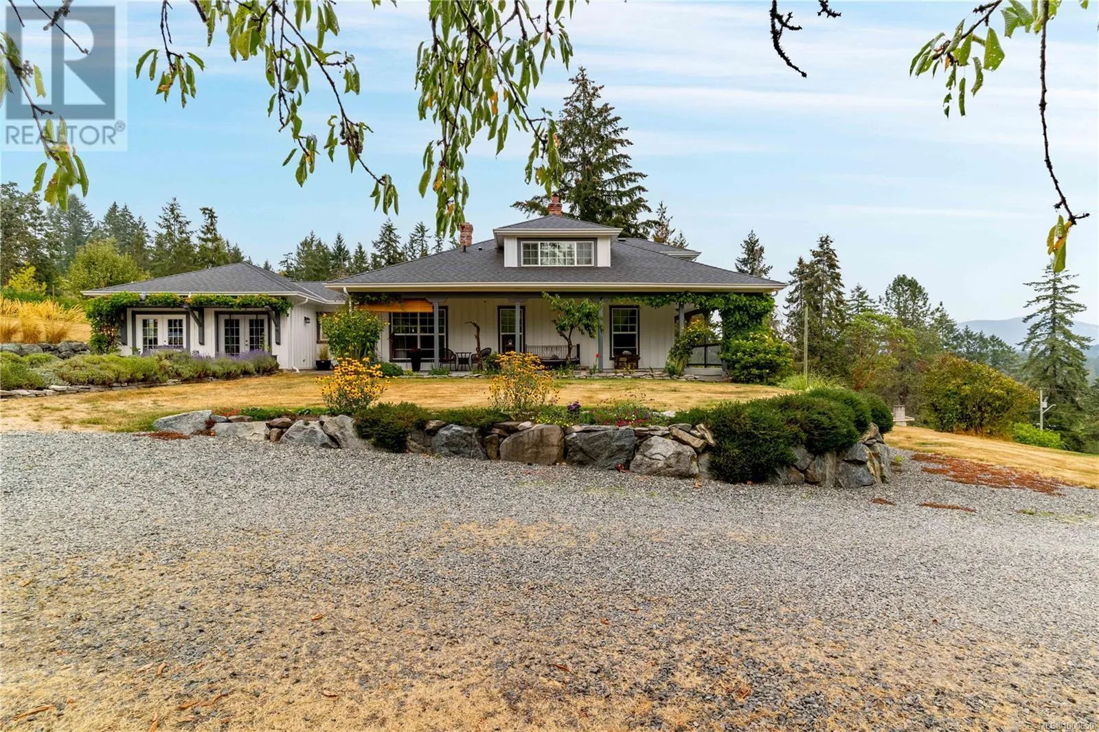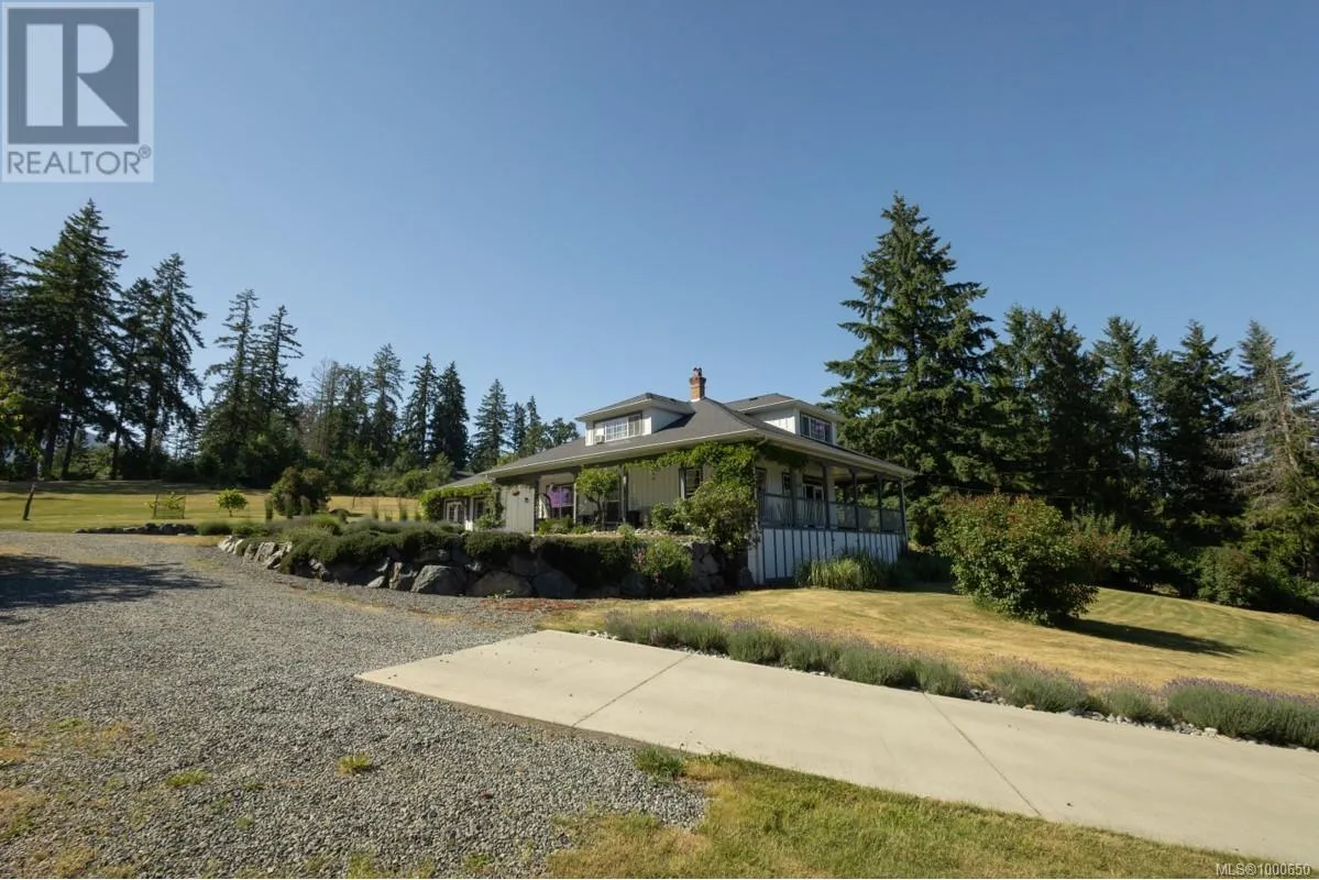 +"PublicRemarks": "Welcome to 7003 Mays Road, a peaceful and private country estate nestled on 84 acres of rolling meadows, ponds, forest, and tranquil trails. Originally built for Don Hays and now in its third ownership, this beautifully maintained home showcases stone and stucco construction, a new roof (2024), and spacious, light-filled interiors with vaulted ceilings up to 16 feet and crown moulding throughout. Inside, you’ll find large, inviting rooms, including a chef-style kitchen with updated appliances and a huge pantry, open to the dining and living areas. The upper-level primary suite is a true retreat, featuring a jetted tub, towel warmer, fireplace, gigantic walk-in closet, laundry chute, and private decks to soak in the views. There are three fireplaces in total—perfectly placed in the living room, family room, and primary bedroom. The finished basement includes ample storage, 2 more bedrooms, a rec room, a huge flex space, and a separate entrance, ideal for suite potential. The estate is rich with features: a large laundry room, 2 heat pumps with dual zones and electric backup, a wood-burning furnace, and hardwood, tile, and carpet flooring. Outside, enjoy a covered deck overlooking a fenced orchard with cherry, apple, pear, and plum trees, all irrigated from a pond on the property. Garages include a 2-bay attached garage, plus separate 1-car and 4-car detached garages. There’s also a unique dance studio with fir flooring reclaimed from the Mayfair Bowling Alley. Roughly 15 acres are hayed on Mays Rd and 30 on Herd Rd, contributing to farm status for tax savings. The forested portion—mostly fir—was appraised at $350,000 about ten years ago. Wildlife is abundant, with deer trails and a bird sanctuary in the marshlands. With solid infrastructure, serene beauty, and endless potential, this is a rare chance to own a truly special piece of the Cowichan Valley. (id:62650)"