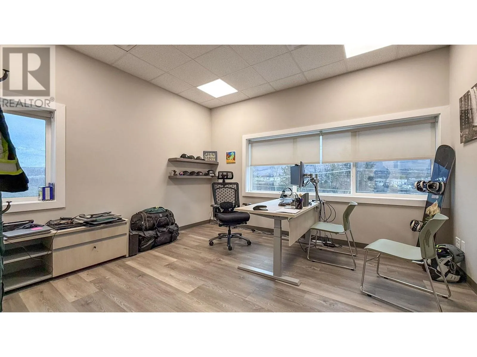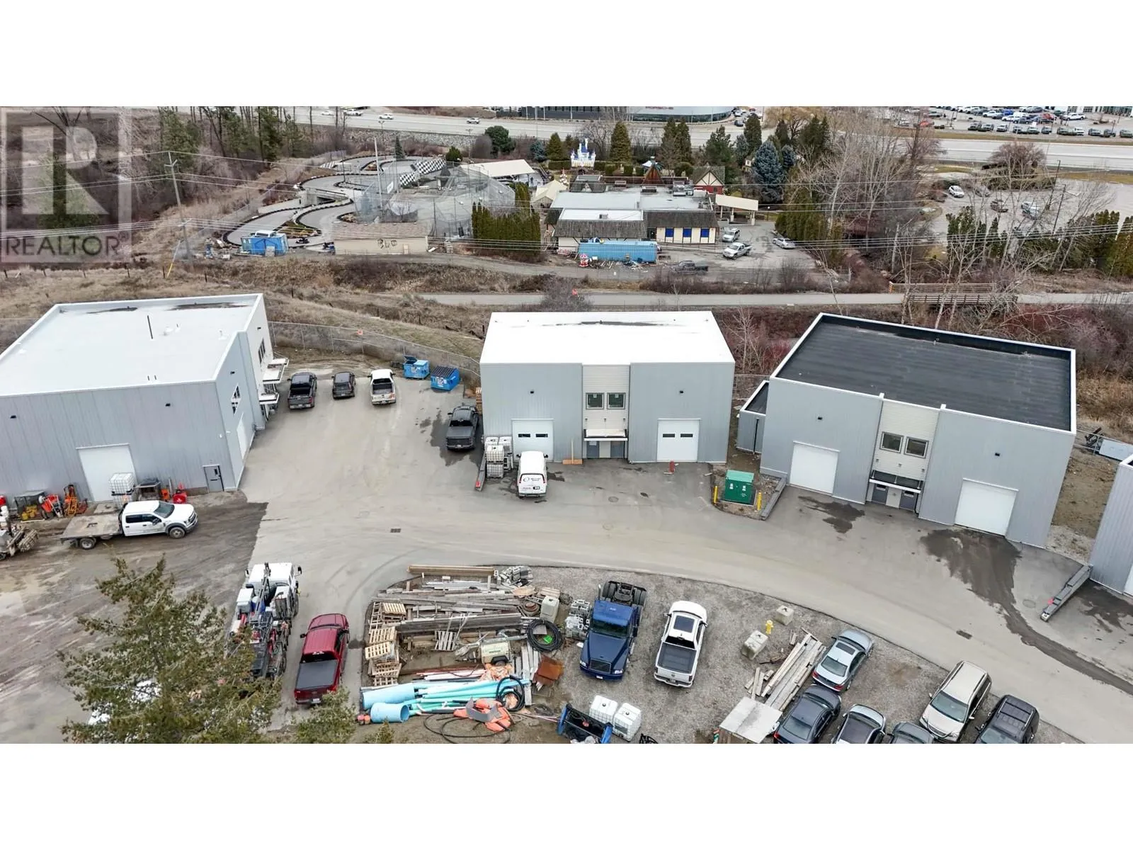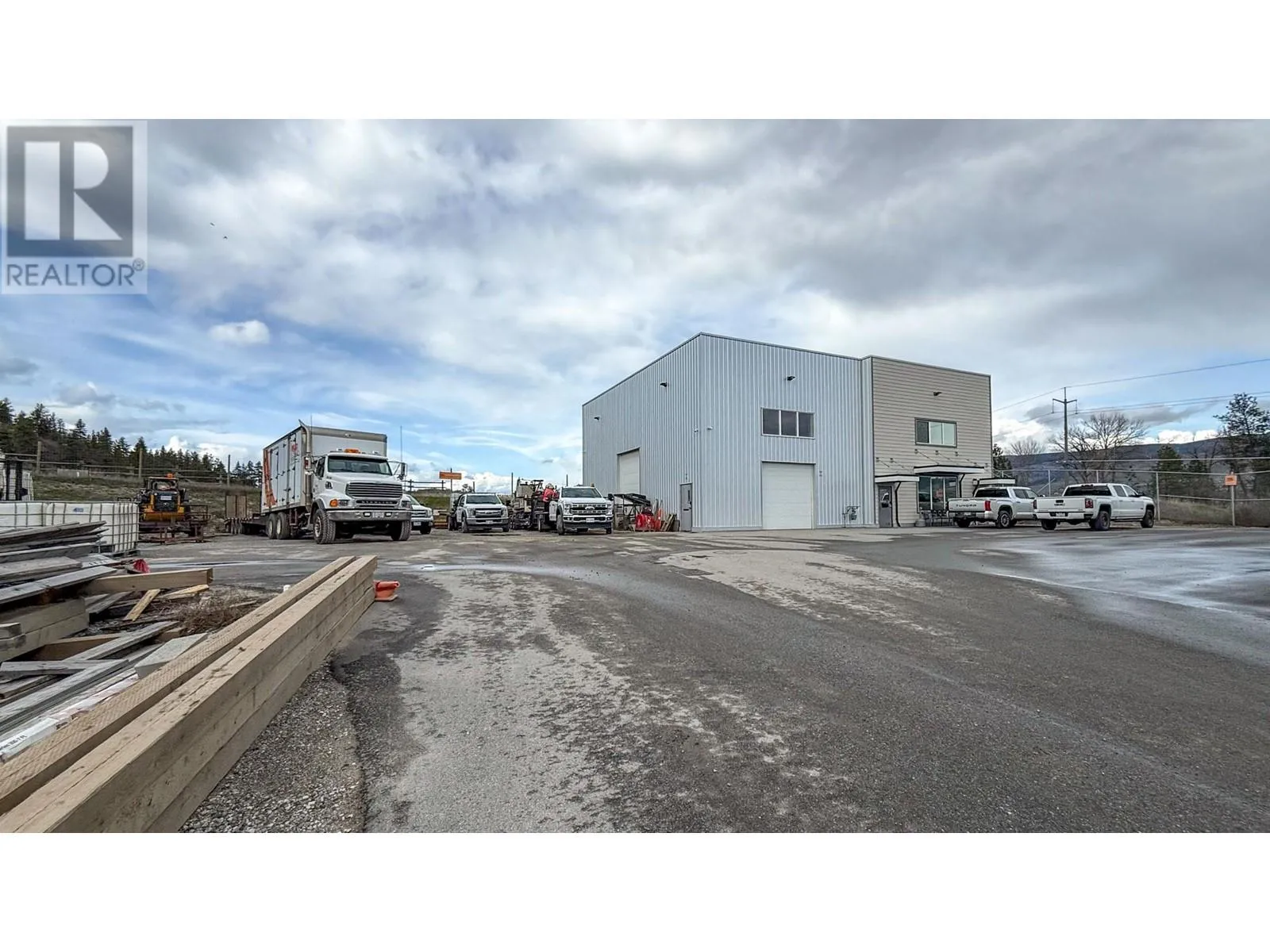 Stand-alone strata building in a newer industrial complex, located just off Highway 97 beside Scandia Golf & Games. Industrial building totaling approx. 4,661 SF includes both warehouse space and office space. Warehouse occupies 1,528 SF in the west part of the building and features high ceilings (nearly 24’ clear) and 2 overhead doors for grade-level loading. Approx. 1,566 SF of