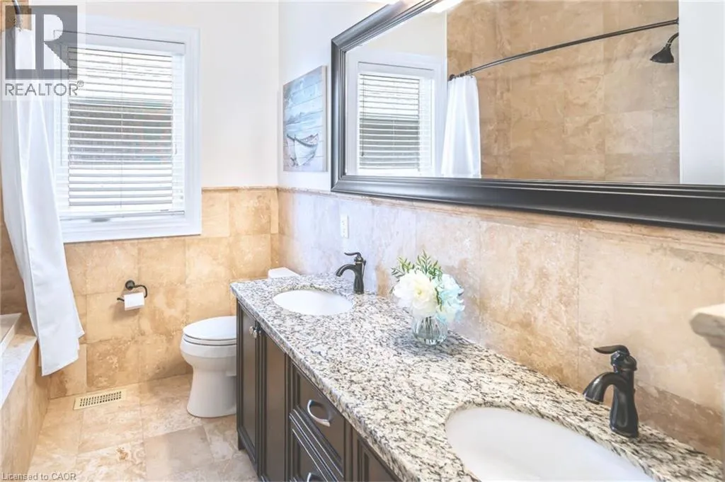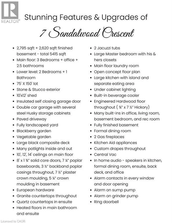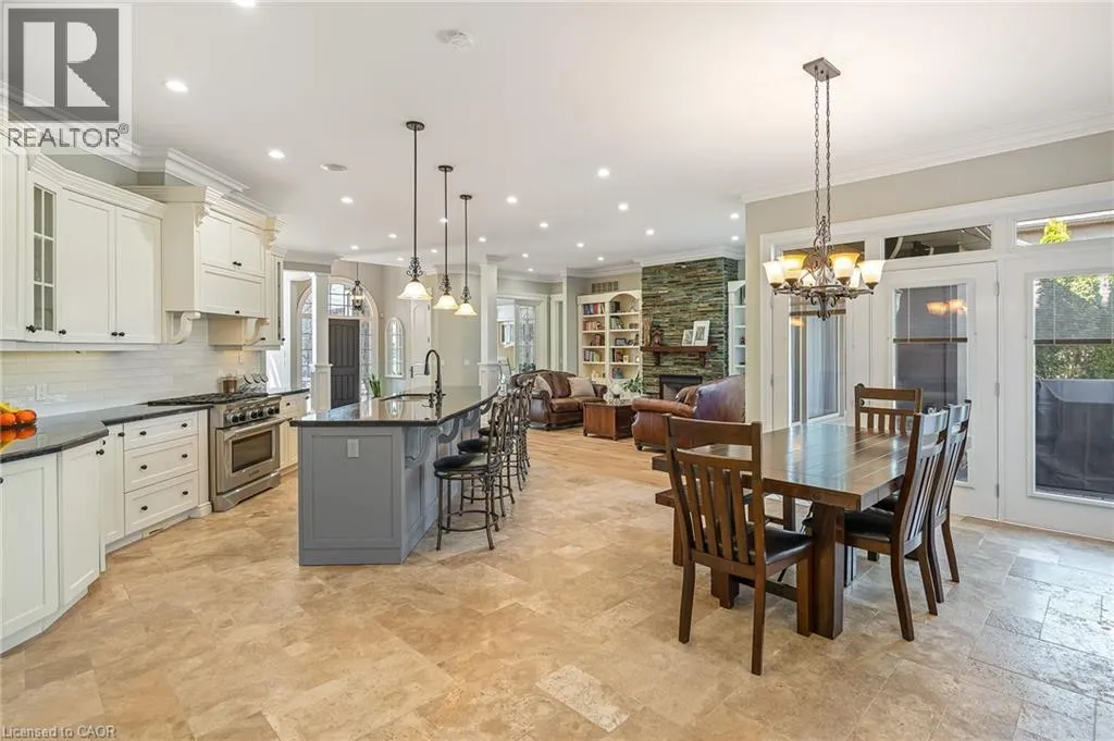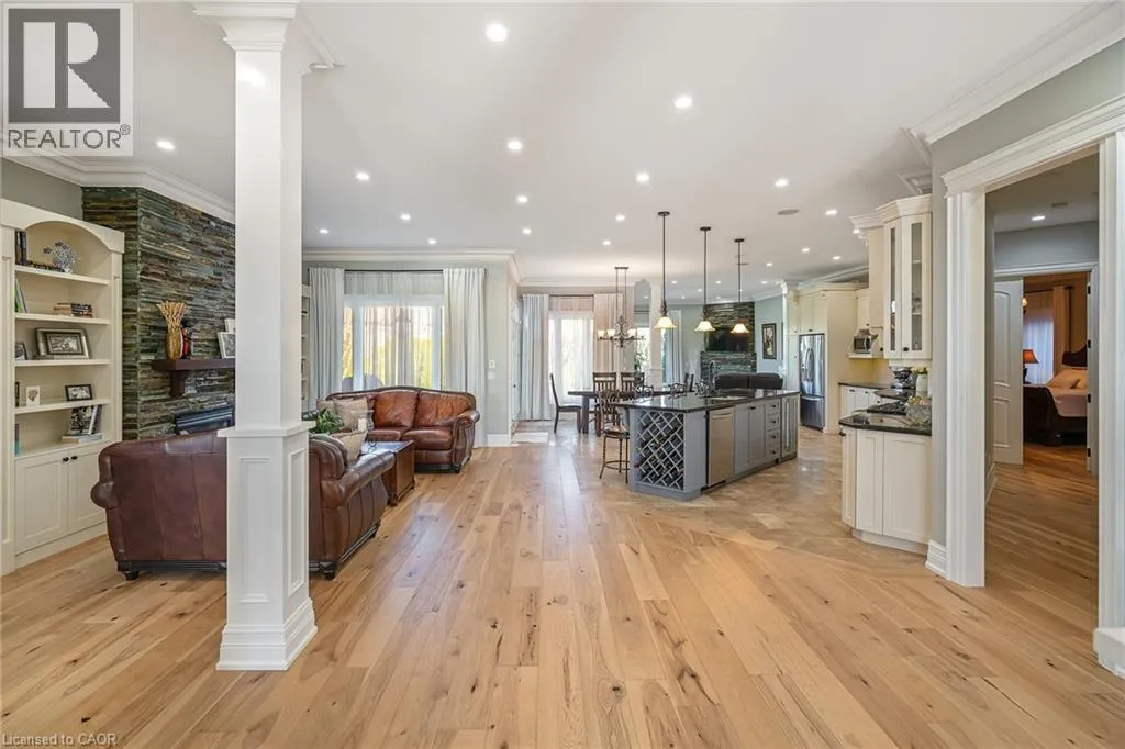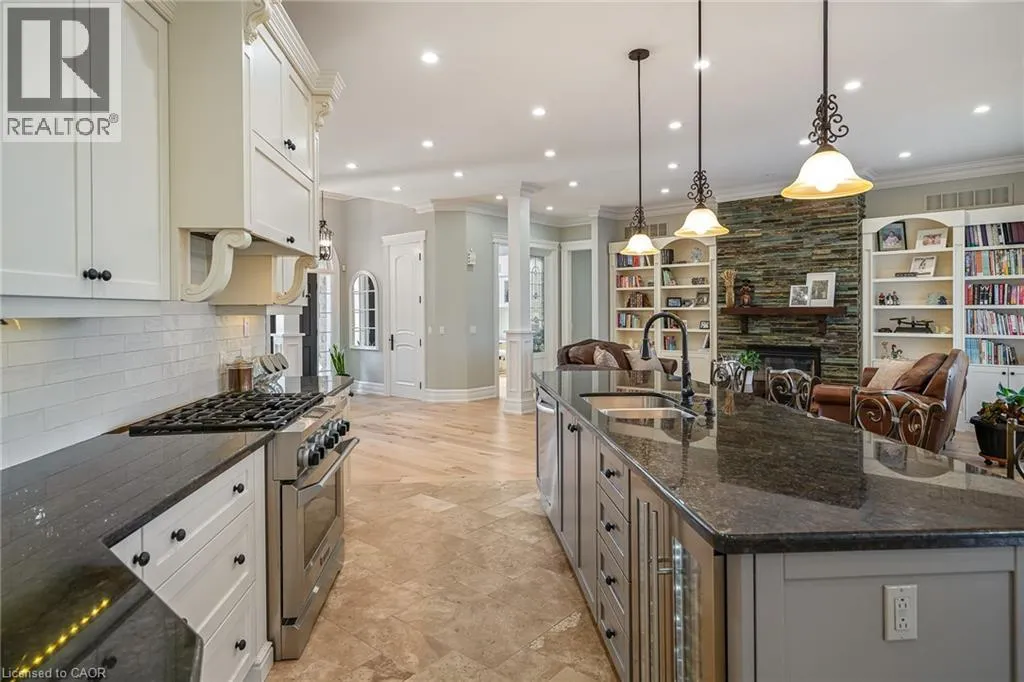 +"PublicRemarks": "This luxury custom-built 2580 sqft bungalow offers exceptional craftsmanship, elegant design, and highly functional multi-generational living spaces throughout. Fully finished basement makes it nearly 5000 sqft finished! Designed with versatility and comfort in mind, the home features three complete kitchens each finished with custom cabinetry, quartz countertops, premium appliances (two gas ranges and one electric), three refrigerators, three dishwashers, and built-in microwaves-perfect for hosting large gatherings or offering private, independent living for extended family members. The main level showcases 12-foot coffered ceilings, engineered hardwood flooring, custom roller blinds, and beautifully appointed living areas highlighted by two gas fireplaces. For added everyday comfort, the home includes heated tile floors in three bathrooms and the lower-level kitchen. A self-contained 1-bedroom granny suite with its own entrance and dedicated parking provides privacy and flexibility, while the fully finished lower level includes two additional bedrooms, a full bathroom, a walk-out, and a spacious walk-in fruit cellar. The property features two full laundry rooms, each equipped with washer, dryer, laundry tub, and storage. Additional upgrades include Russound integrated sound and satellite wiring, a full security camera and alarm system with monitoring option, and an in-ground sprinkler system for effortless exterior upkeep. The home is fully fenced, professionally landscaped with thoughtful rock and garden design, and includes a covered outdoor porch to enjoy peaceful surroundings in every season. Every detail - from cabinetry to ceiling design to layout functionality - reflects the care put into creating a home that is both luxurious and deeply livable. This is a rare offering that combines elevated finishes, spacious design, and true multi-use living under one roof, providing comfort, privacy, and long-term value for its next owner. (id:62650)"