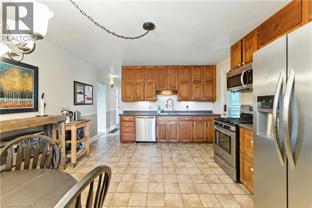 +"PublicRemarks": "St. George 3 bedroom bungalow located on a deep 204 ft lot. Handymen and self employed will love the huge detached shop with heat and hydro. Main floor living room, large eat in kitchen with walk out to a 3 season sunroom that overlooks the private tree lined yard with firepit. Finished rec room in the basement, second bathroom roughed in. Plenty of living space. Walk to downtown, school, and parks (id:62650)"