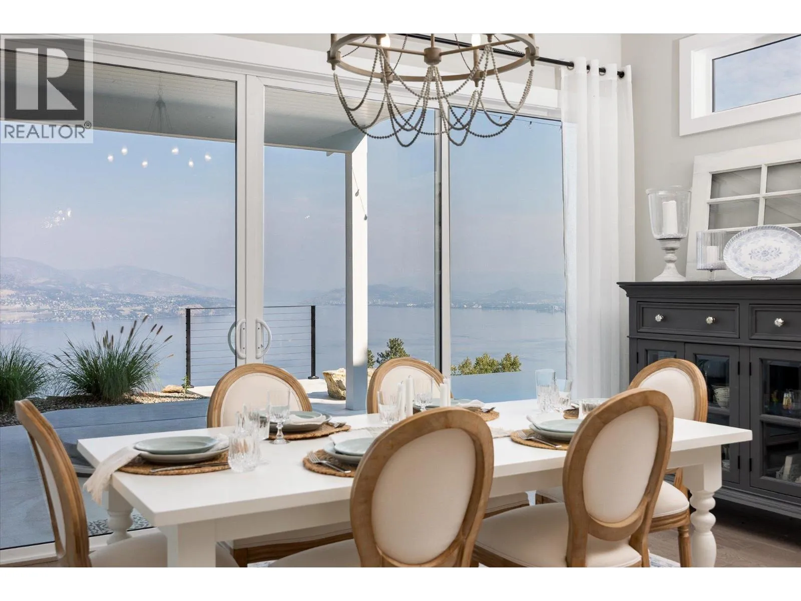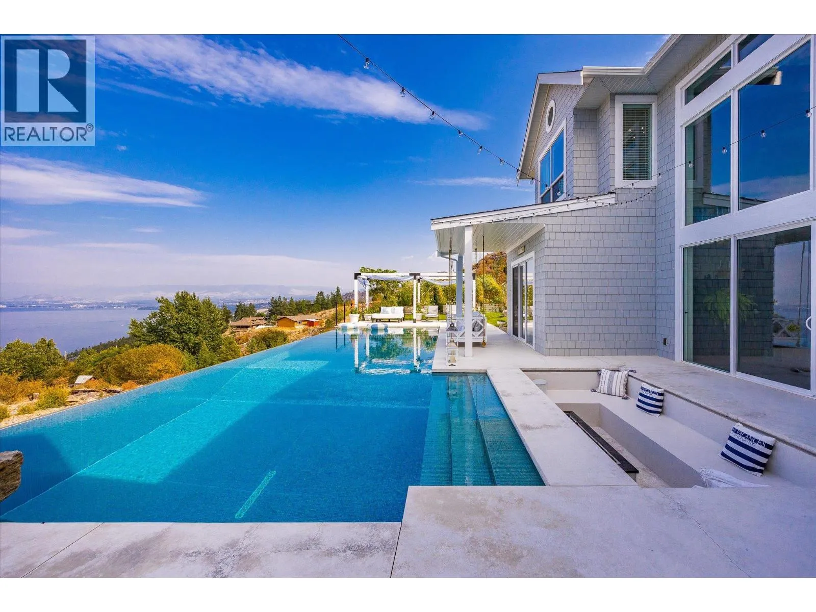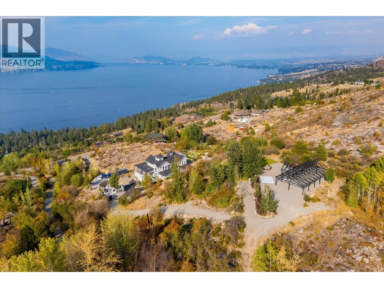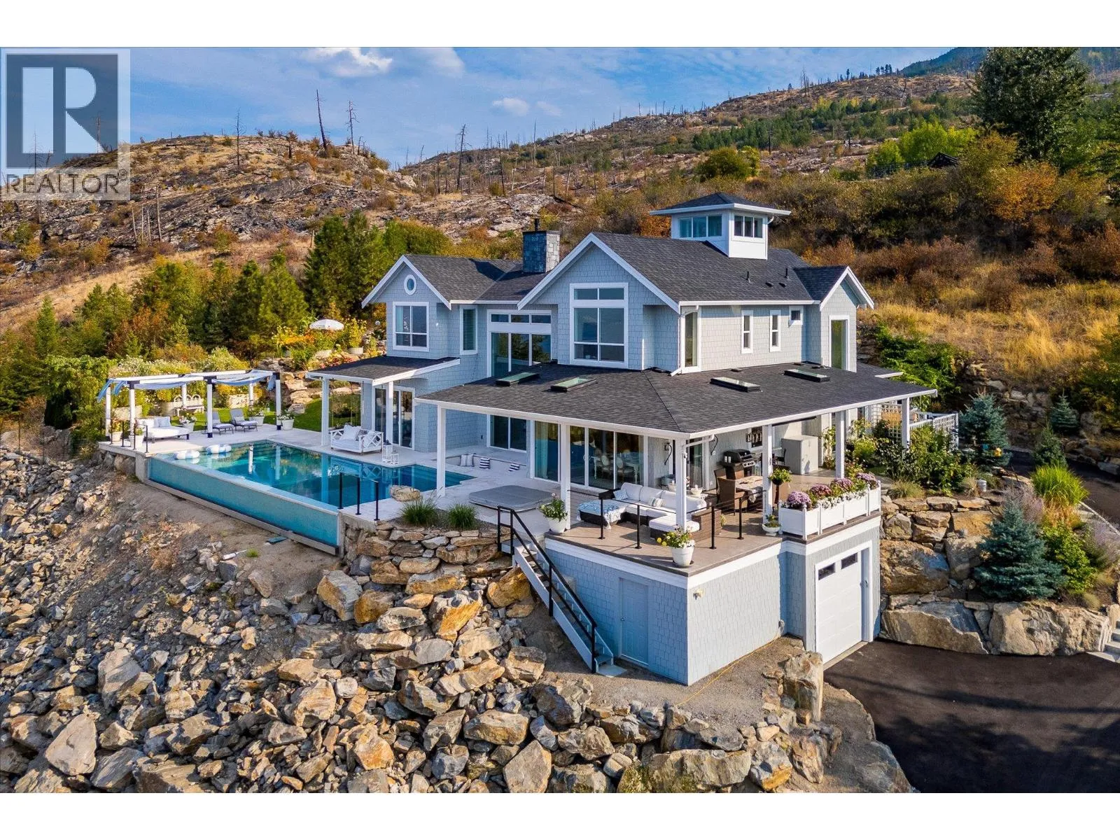 The best view in Kelowna. 2019-built 4 bedroom, 5 bathroom, 5,100+ square foot Modern Hamptons residence perched on a 5.129-acre lot in the Upper Mission area of Kelowna! Upon entering the property, you’re greeted with your substantive driveway that carves through the rock, creating a unique estate feel. The grounds include substantial mature landscaping, a custom greenhouse/garden area, a large