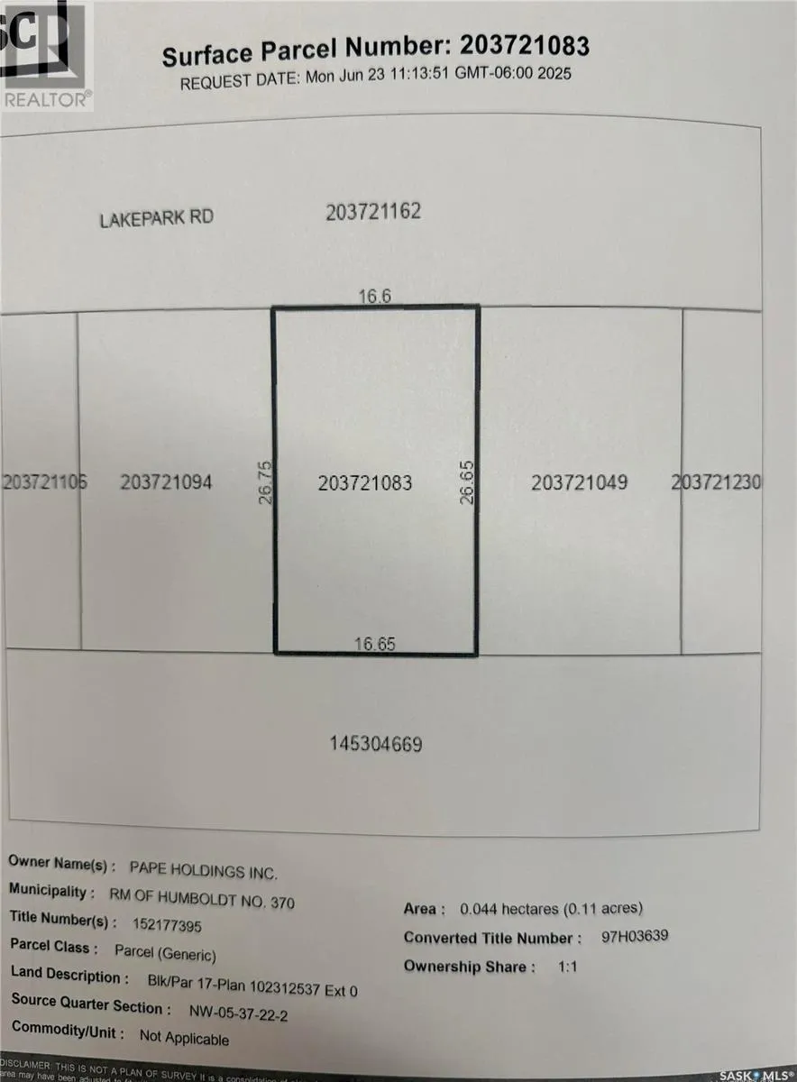 Enjoy lake living on this lot. The Seasonal lot is .11 acre. Culverts and driveways have been installed and trees planted. Lot has 100 amp power to property line. Buyer to sign Servicing Agreement with Pape Holdings Inc.. Buyer responsible for utility hookup costs. Buyer is responsible for septic holding tank cost and install. Buyers to consult with RM of