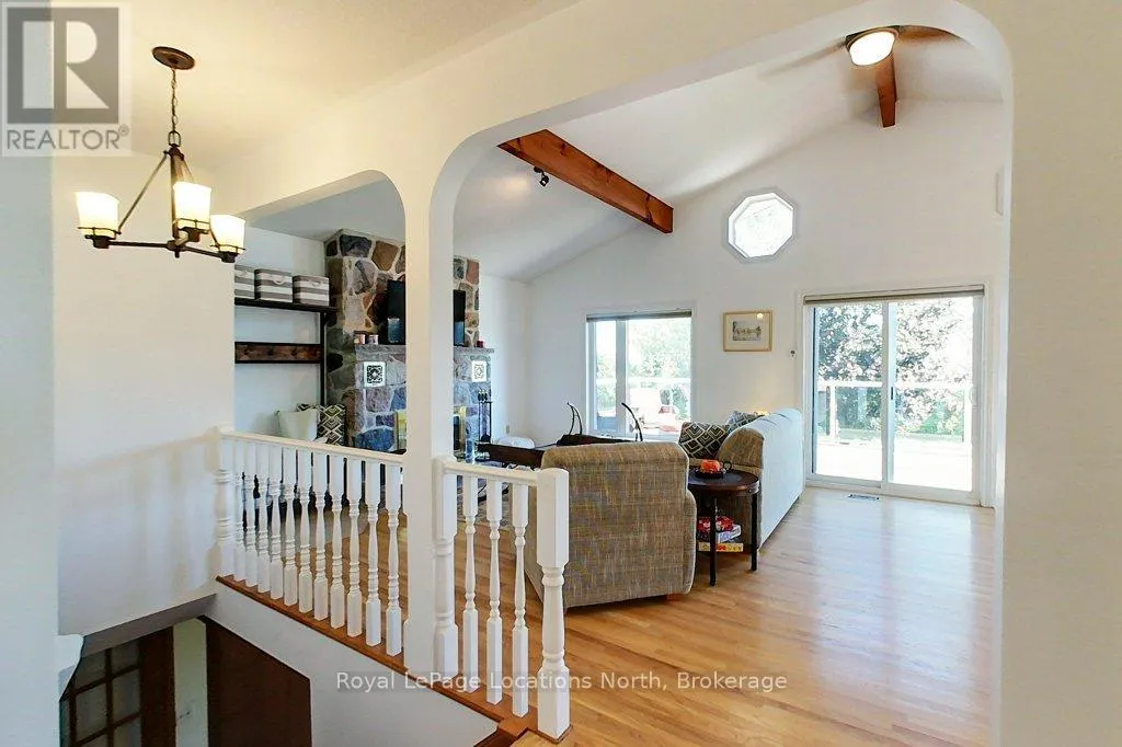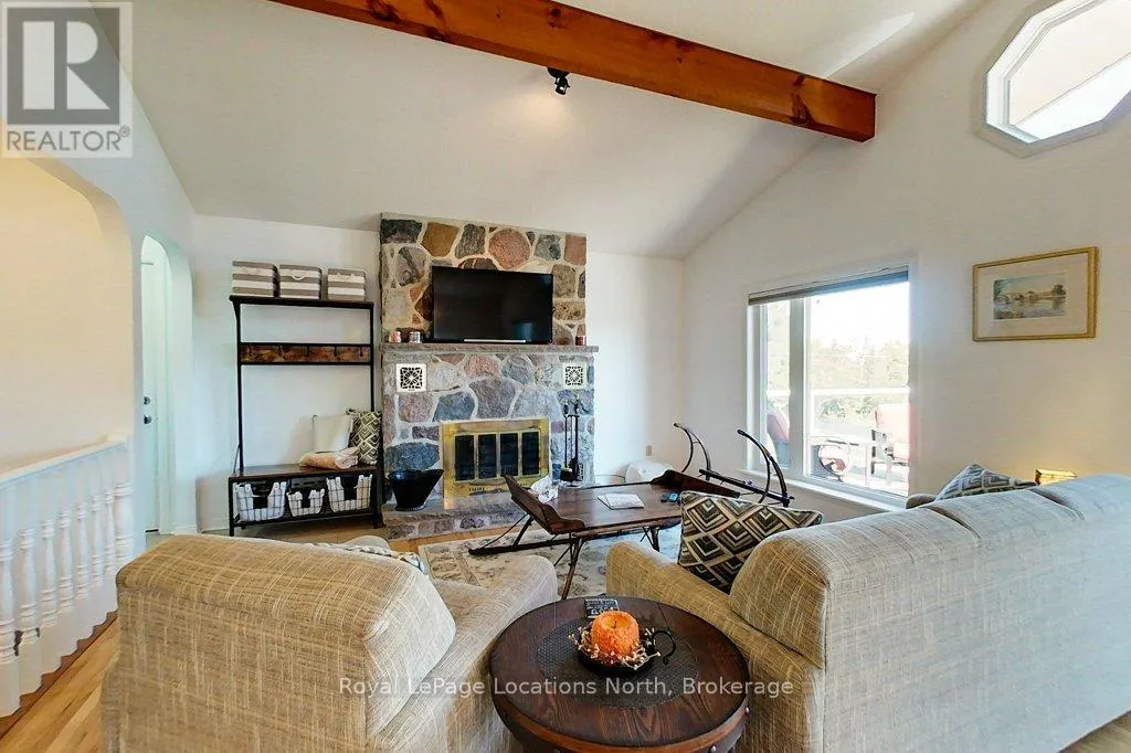 Poised on a gently sloping lot, this captivating chalet style, four-bedroom, two-bathroom home is filled with natural light and partial views of Georgian Bay and water access across the street. Some of the most attractive highlights of this home include the cathedral ceiling in the main living area, the floor to ceiling stone fireplace and the walk out to the