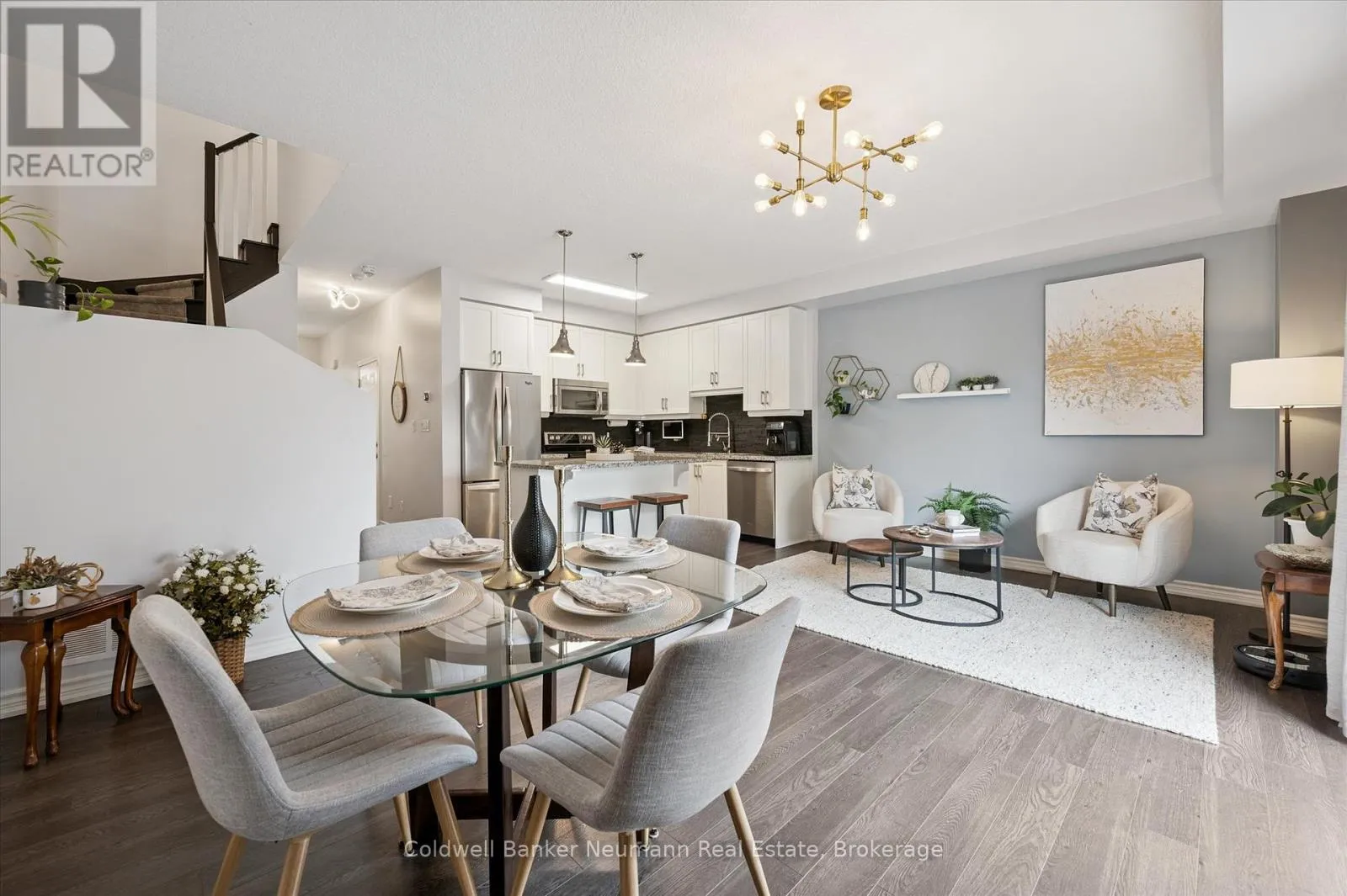 This FREEHOLD townhome, only nine years young and offers stylish curb appeal. The exterior blends brick, stone, and siding, complemented by a stamped concrete walkway that leads to a welcoming front porch. Inside, a bright foyer introduces the main level where 9-foot ceilings create an open and elegant feel. The thoughtful floor plan seamlessly connects the dining area, living room,