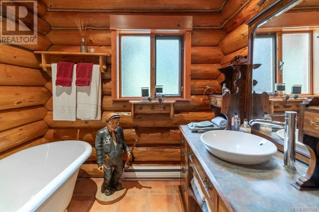 +"PublicRemarks": "Welcome to your private forest retreat on beautiful Vancouver Island. This extraordinary 4.86-acre estate offers the perfect blend of luxury, nature, and functionality—just minutes from the Nanaimo Airport and Duke Point ferry, and steps from stunning beaches ideal for kayaking and beachcombing. Nestled beside a protected old growth forest (Wildwood), the custom log home spans over 3,900+ sq ft and is surrounded by peaceful, natural beauty. A private lake winds through the property, featuring a charming pergola with a covered fireplace and a cascading waterfall. The estate is beautifully lit for evening strolls along custom garden paths or the private road circling the grounds. Outdoor highlights include a lakefront campsite with a built-in stone firepit and BBQ, a gardener’s paradise of indigenous and exotic plants, an elevated rose garden, and multiple seating areas with lake views. There are 7 garages including drive-through and workshop-ready spaces, a 10x20 storage building, a large fenced dog area with custom 10x10 dog house, a well with dual 2,200-gallon cisterns, and designated farm status. The handcrafted log home features full round logs, vaulted ceilings, skylights, and hardwood floors. Inside, you’ll find a granite-accented entry with custom double doors, an expansive living/dining space with Blaze King wood stove, and a chef’s kitchen with solid maple cabinets, copper backsplash, large island, pass-through window, and walk-in pantry. There are four spacious bedrooms, including a master suite with private patio, wood stove, dual walk-in closets, spa-inspired ensuite, and sitting room with clawfoot tub. Additional features include a loft bedroom with spiral staircase, private-entry bedroom with study, split full bath with antique vanities, and attic access. A detached carriage house includes a 1-bedroom suite with kitchen, laundry, wood stove, and a large lake-view deck—perfect for guests or rental income. A truly rare and versatile West Coast gem. (id:62650)"