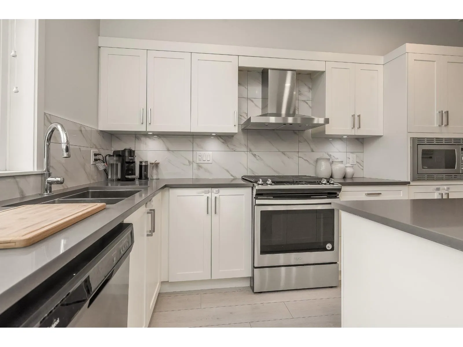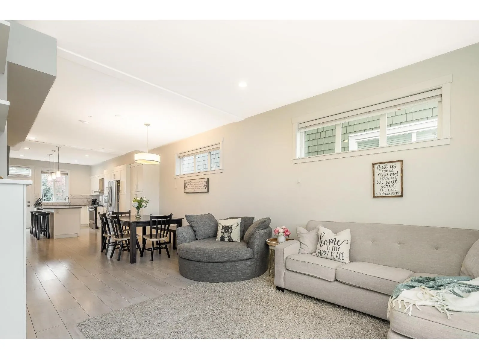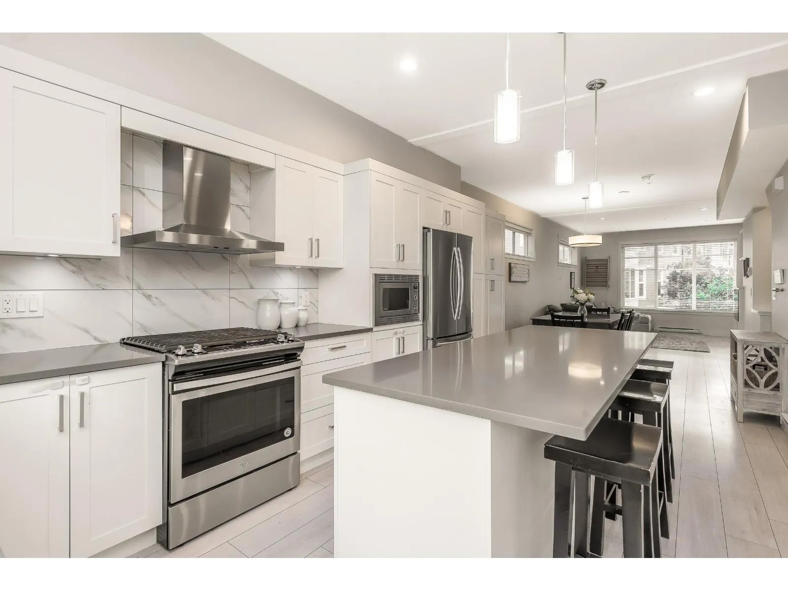 Welcome to “Hutton” – a beautifully upgraded 3 bed, 3 bath townhome in Willoughby Heights. Featuring a bright white kitchen with quartz counters, gas range, spacious island, and custom pantry storage. The open living space includes built-in entertainment units, new laminate flooring on the stairs and upstairs hallway, and a main floor powder room. Upstairs offers a spa-inspired ensuite, walk-in