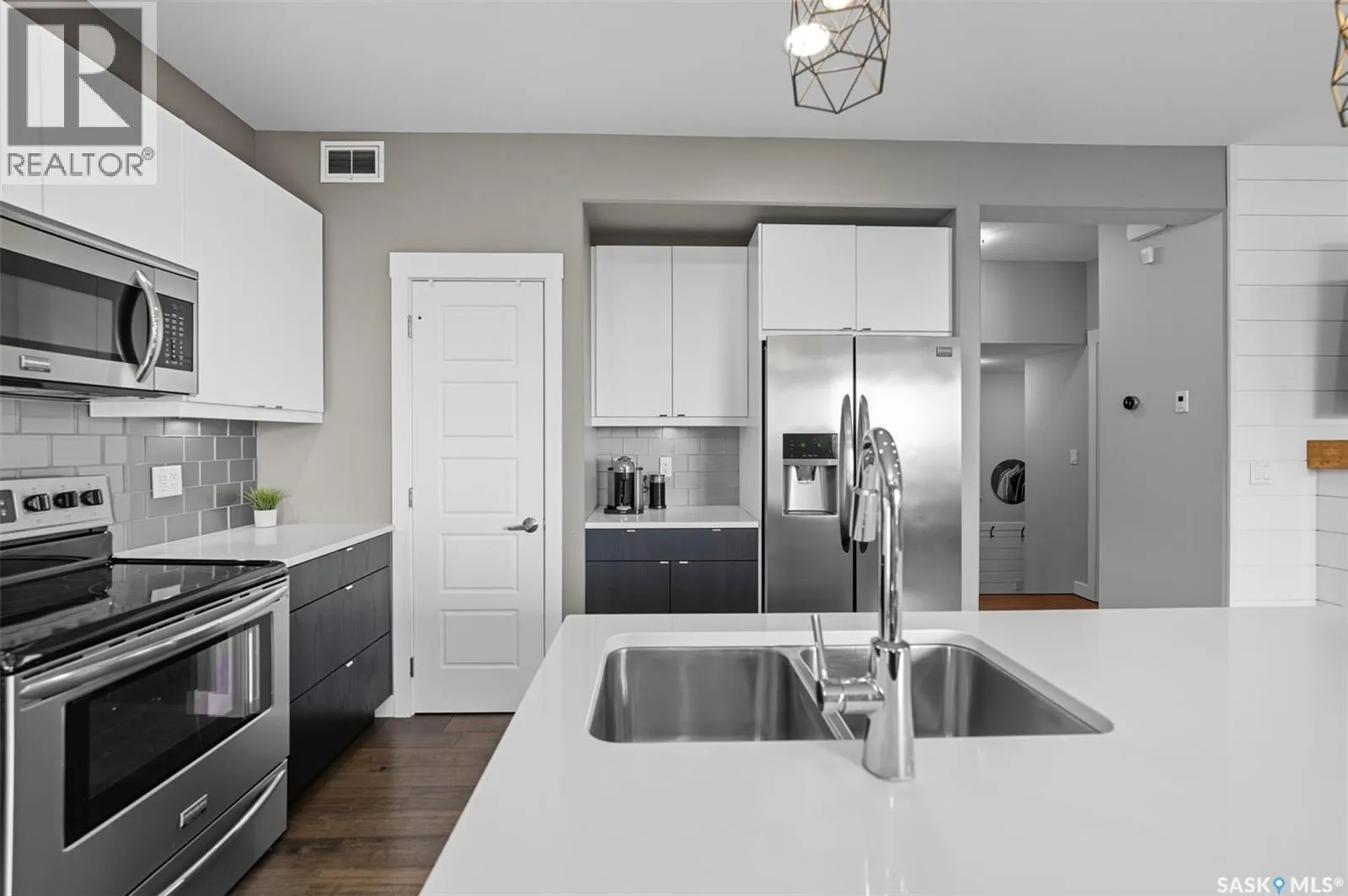 Welcome to 1319 Steeves Ave, in desirable Kensington, move-in ready, built in 2015, four bedroom, three bath, hardwood and porcelain tile floors, carpet upstairs, kitchen features island plus counters with white quartz tops, glass backsplash, large pantry, mudroom, triple glazed windows, triple concrete drive, heated garage with tandem door, west-facing yard, beautifully landscaped, fenced, with trees/shrubs, lawns front & rear,
