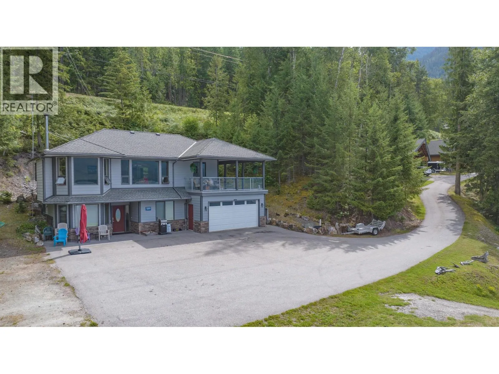 First time on the market—welcome to the legendary O’Brien’s on the Lake, a rare and breath-taking opportunity with endless possibilities. This stunningly maintained, income-producing property features three beautifully handcrafted log cabins, each radiating rustic charm and timeless craftsmanship. The main home includes a spacious rental suite with 3 bedrooms and a flex space, while the upper level offers 2 additional