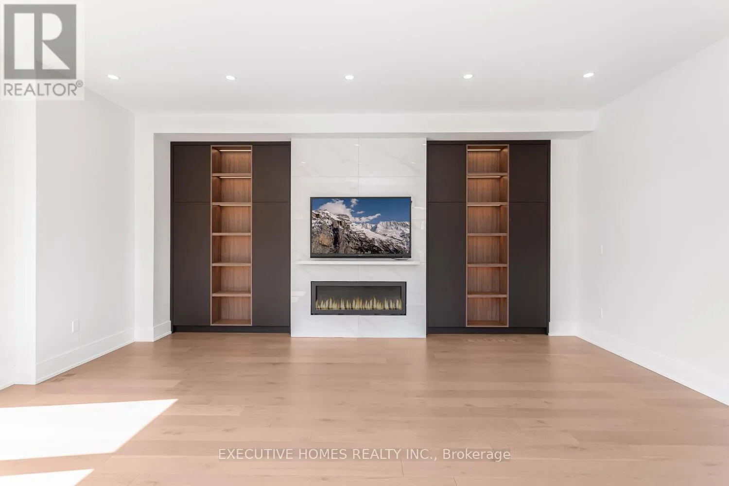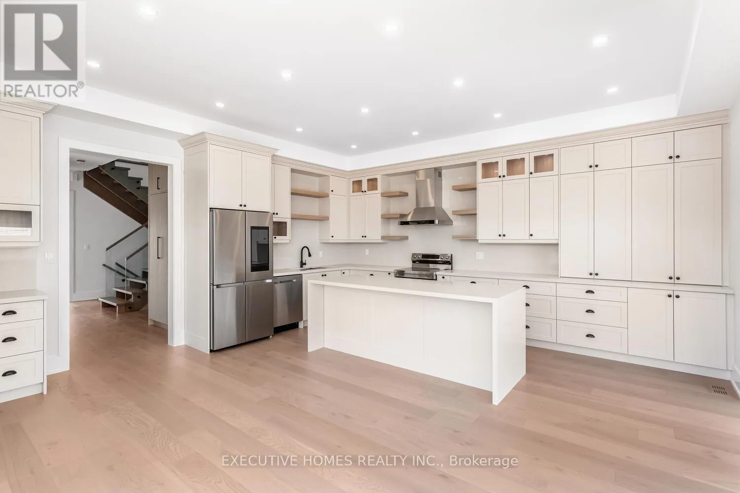 This newly built custom home by a Tarion registered builder in Lakeview features a bright foyer with open stairs and a glass railing, a main floor office, and a built-in closet. The spacious great room includes a gas fireplace with built-in shelving, while the stylish kitchen is equipped with stainless steel appliances, a beverage fridge, and elegant quartz counter tops,providing