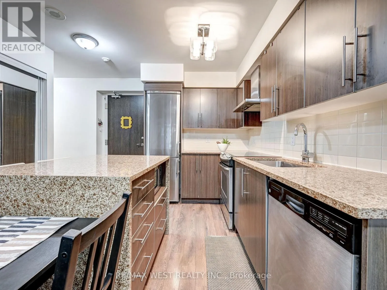 Discover urban and convenient living at its finest. Unit layout features two generous bedrooms and two full bathrooms. An open-concept kitchen is ideal for entertaining, showcasing stainless steel appliances, a ceramic backsplash, and a stunning Quartz waterfall island. The primary suite includes a private ensuite and walk-in closet, with laminate flooring throughout. Building amenities feature 24-hour concierge, an indoor pool,