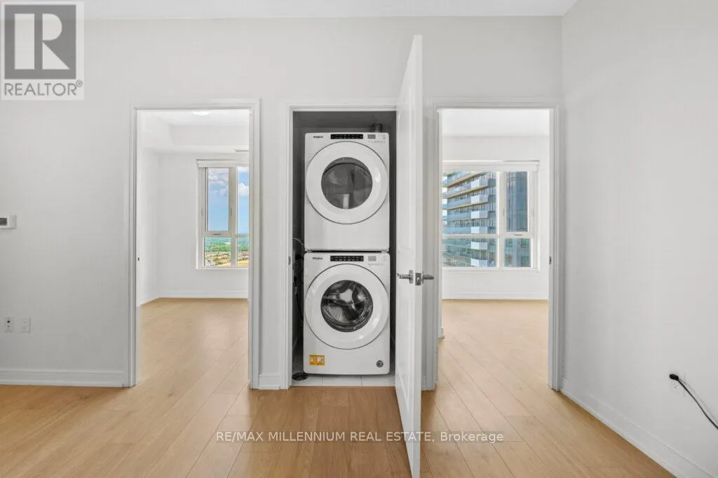Prime Mississauga Location! Bright and spacious 2-bed, 2-bath, 2 underground parking spaces, and 1 locker condo with a large primary bedroom featuring a 4-piece ensuite. Open-concept living and dining with large windows and walkout to a balcony offering unobstructed city views. Modern kitchen with stainless steel appliances with custom island and quartz countertops. Includes ensuite laundry. Building amenities: concierge, lounge,