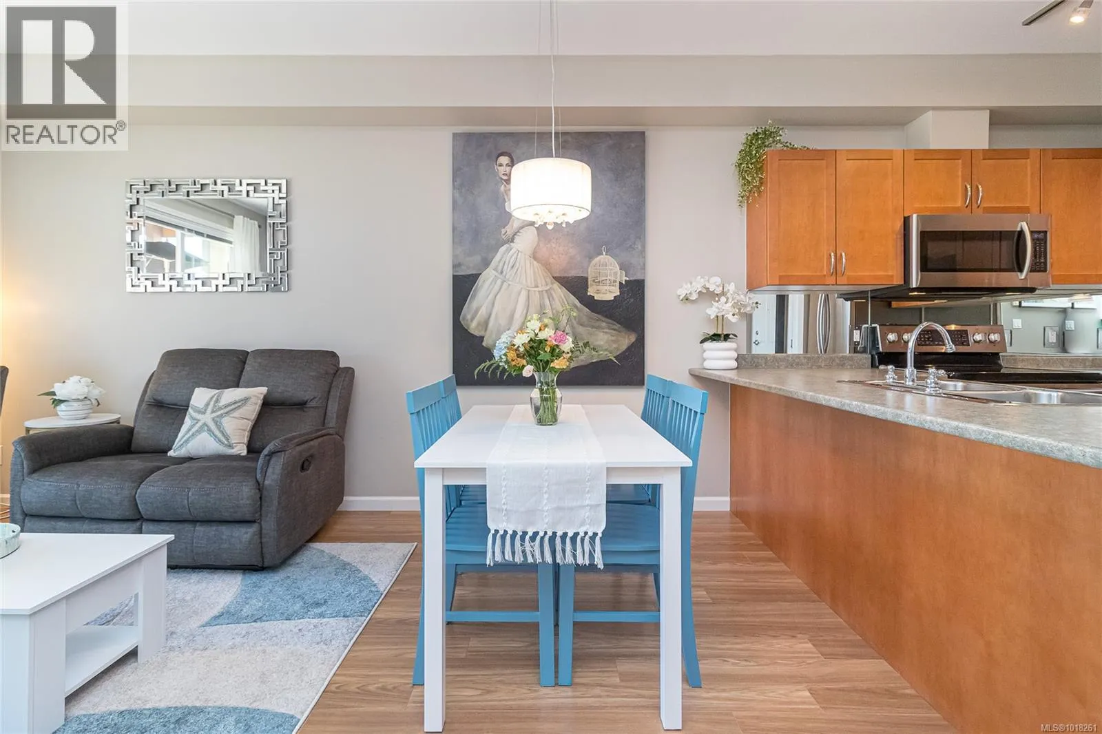 +"PublicRemarks": "Discover modern comfort in this light-filled 1 bed, 1 bath condo perfectly situated in the heart of Central Saanich. The well-maintained residence boasts soaring 9 ft ceilings, a stylish kitchen with a built-in eating bar, gleaming stainless appliances, and a custom backsplash. Newer laminate flooring flows seamlessly throughout, complemented by updated fixtures and contemporary window coverings. Step onto the east-facing deck to savor your morning coffee while taking in distant ocean vistas. Amenities include in-suite laundry, secure underground parking, bike and storage locker. Located in vibrant Saanichton Village, you’re mere steps from Thrifty Foods, cafés, and recreational facilities, with quick access to beaches, the airport, and ferries, making this serene community retreat an opportunity not to be missed. (id:62650)"
