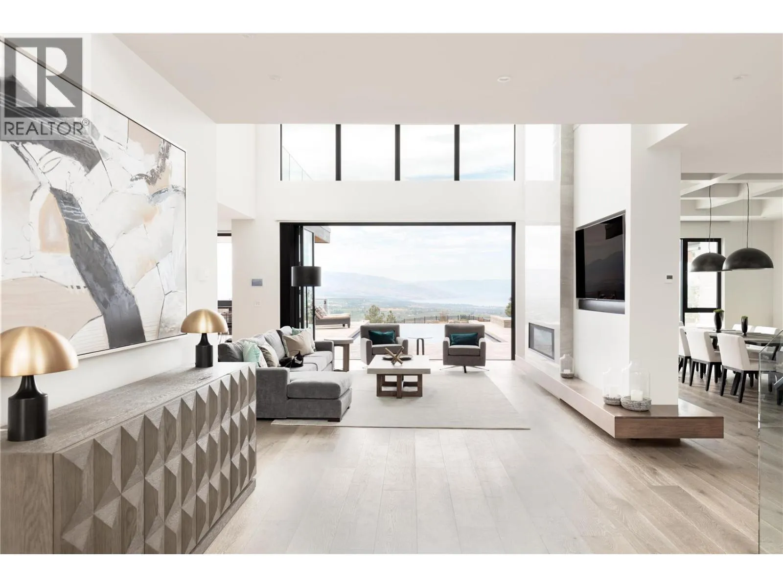 Perched on an expansive double lot, this stunning seven bedroom, six bathroom home boasts 270 degree views of the gleaming lake, city lights, and rolling hills. You are welcomed with soaring ceilings and windows to maximize natural light. The open concept main level starts with the great room, leading into the gourmet kitchen with butler pantry. A dedicated dining room