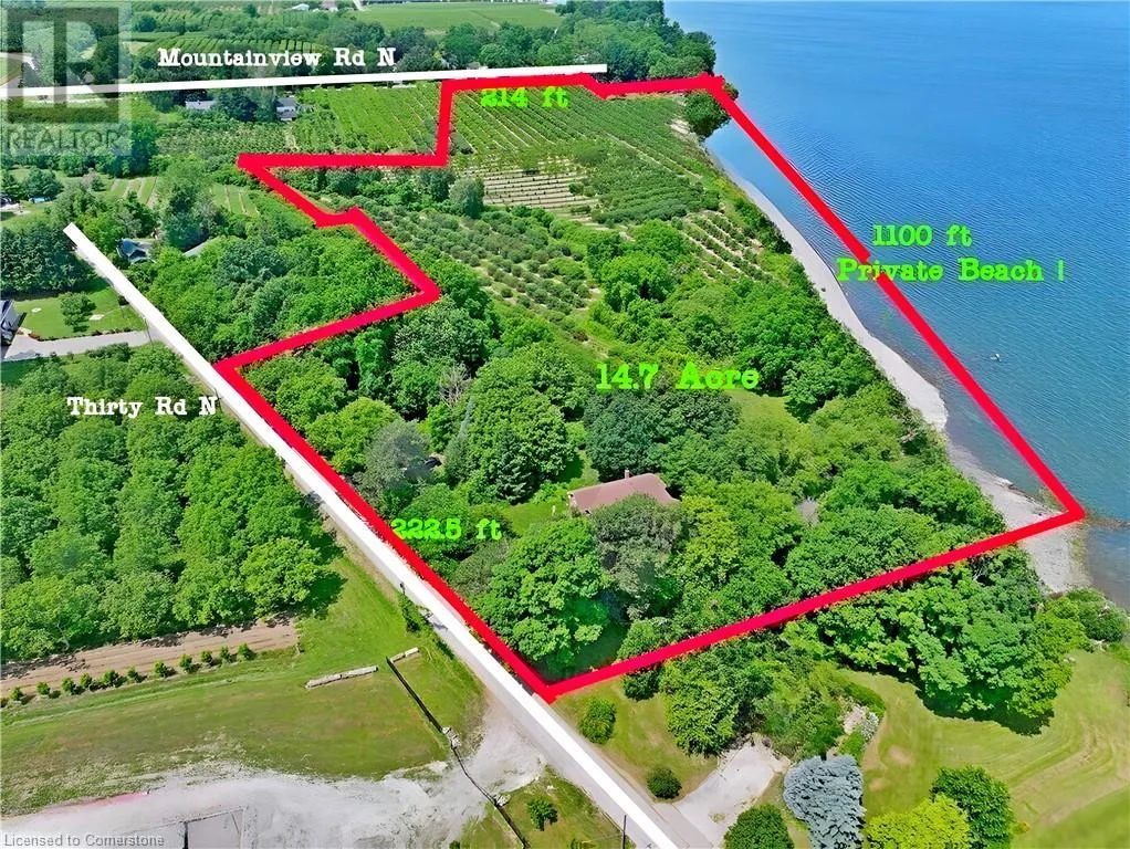 Possibly the most desirable Lake Ontario waterfront property from the GTA to the Niagara Region! This secluded 14.59-acre paradise is perfect for investors or those seeking a private lakefront retreat. Located on two quiet, scenic dead-end lakefront roads, the property offers over 200 ft of frontage on both Mountainview Rd and Thirty Rd N. Just minutes to the QEW, nearby