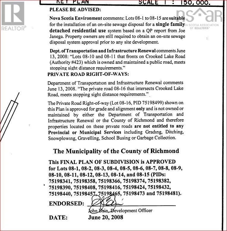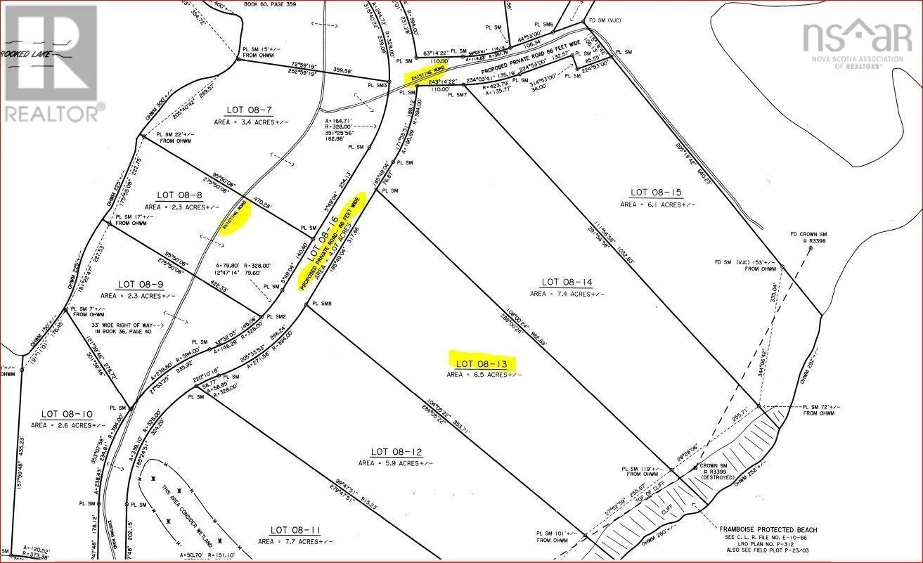 Oceanfront Property! Lot 08-13 Crooked Lake Rd (Framboise). This stunning 6.5-acre parcel opens onto the picturesque sandy Morrison (Framboise) Beach/Trail. Enjoy morning walks on the beach, breathe in the crisp ocean air, and be mesmerized by the soothing sound of the surf. The property is land registered, with a Nova Scotia Environment assessment confirming it is suitable for an on-site