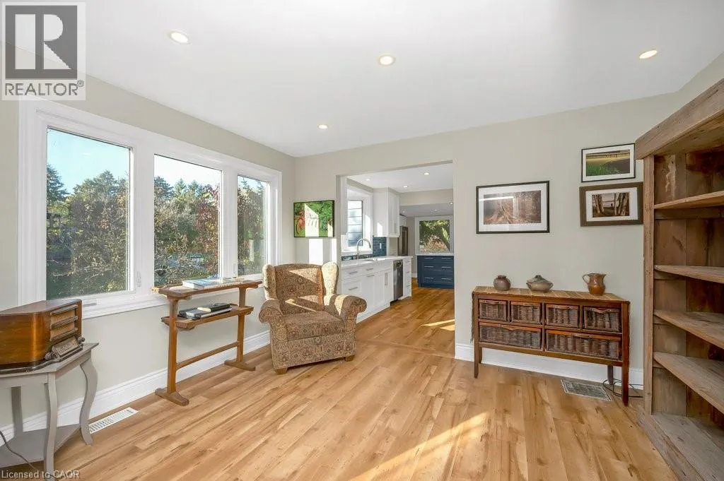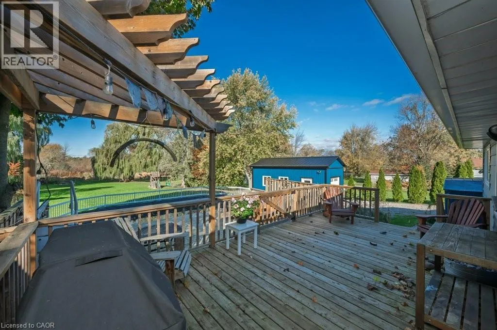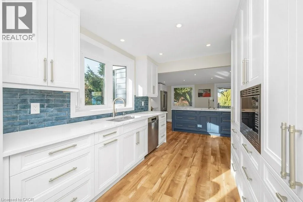 +"PublicRemarks": "Welcome to this stunning 3+2 bedroom, 2 bath updated bungalow perched on Grimsby’s breathtaking escarpment — the perfect blend of in-town convenience and country living. Set on a spacious 2/3 of an acre lot backing onto woodlands and open fields, this home offers peace, privacy, and picturesque views from every angle. Step outside to a gorgeous deck overlooking the pool and massive backyard with century old willow trees, perfect for entertaining around a campfire or relaxing in nature’s backdrop. The bright, open-concept interior features a modern chef-inspired kitchen with quartz counters, multiple sinks and workstations, and an oversized eat-at island designed for both function and style. The cozy family room is anchored by a new high-end gas fireplace, while the bedrooms have been thoughtfully redone with upgrades including custom maple cabinetry, new flooring, and expanded closet space — featuring 8 ft of Pax wardrobes and a new 5 ft built-in. The bathroom has been fully renovated with a step-in glass shower and electric skylight, and every appliance in the home has been replaced. Additional highlights include a newly installed water treatment system a second 4500g cistern, new eaves, a bright sunroom/mudroom, a modern heated garage/workshop with storage loft, a large drive shed, and parking for 8–10 vehicles. Just steps from the Bruce Trail and Adam Dopko Trails, this property offers the best of both worlds — modern comfort surrounded by natural beauty. (id:62650)"