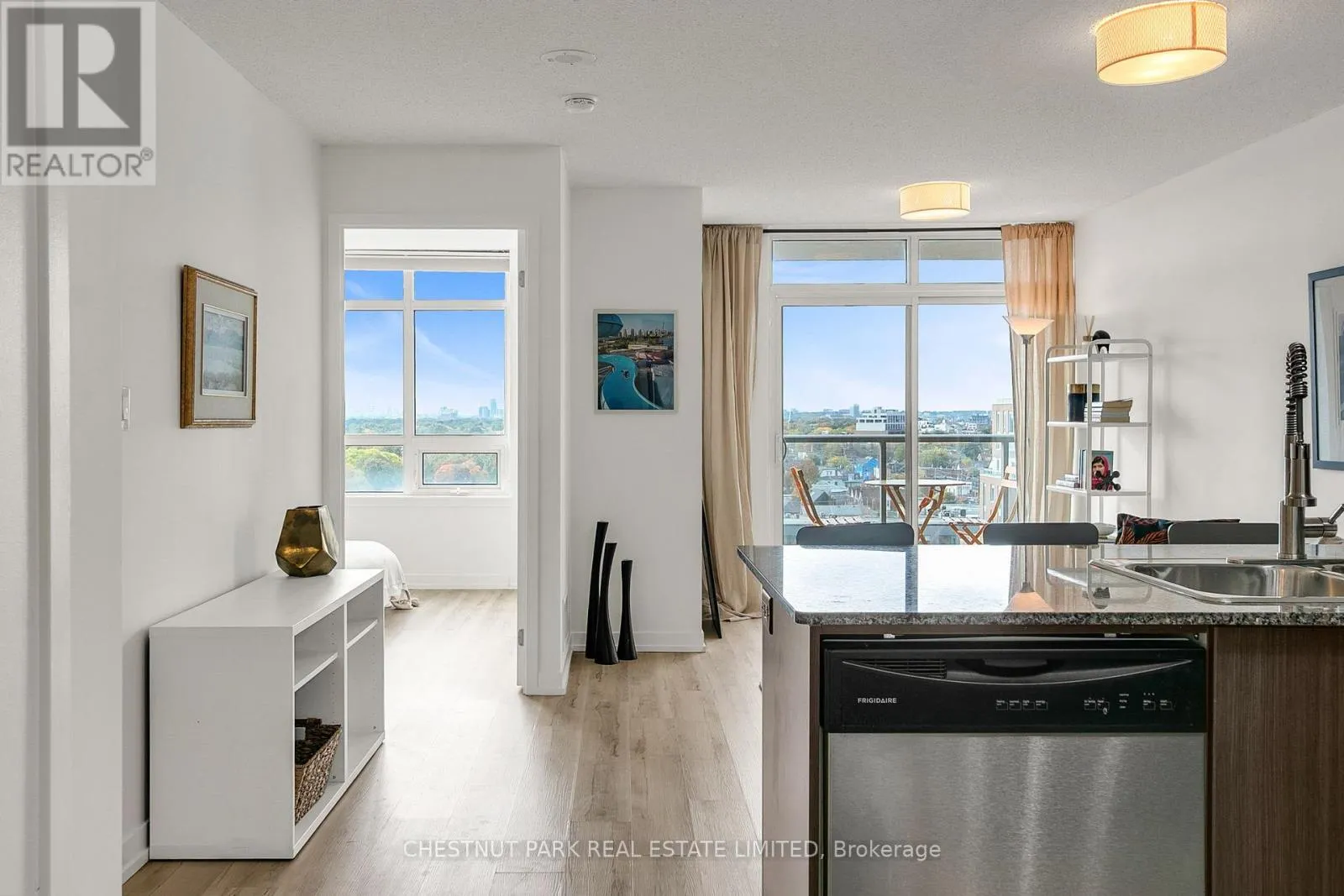 Fabulous Opportunity in the Upside Down Condos in the Junction neighbourhood. This spacious 1-bedroom condo offers 583 square feet of thoughtfully designed living space. Filled with natural light with unobstructed west views in the day and spectacular sunset views in the evening. The open-concept layout features a modern kitchen with stainless steel appliances, granite counters, and a breakfast bar; perfect