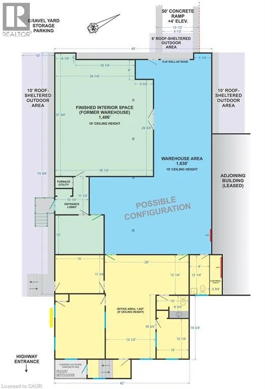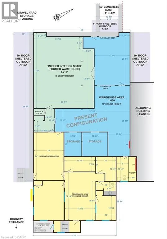Excellent mix of warehouse and office space. Great busy highway exposure. Service commercial zoning. Lots of parking, and outdoor storage including a roof-sheltered outdoor area. Current configuration offers warehouse and storage space with 10′ ceilings, and separate office space including reception area, boardroom and storage, plus covered front entry. Property available January 1st. $10.00 per