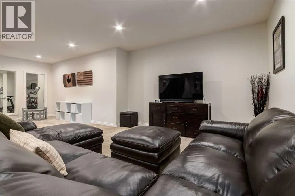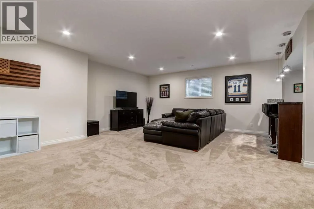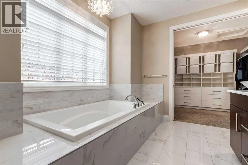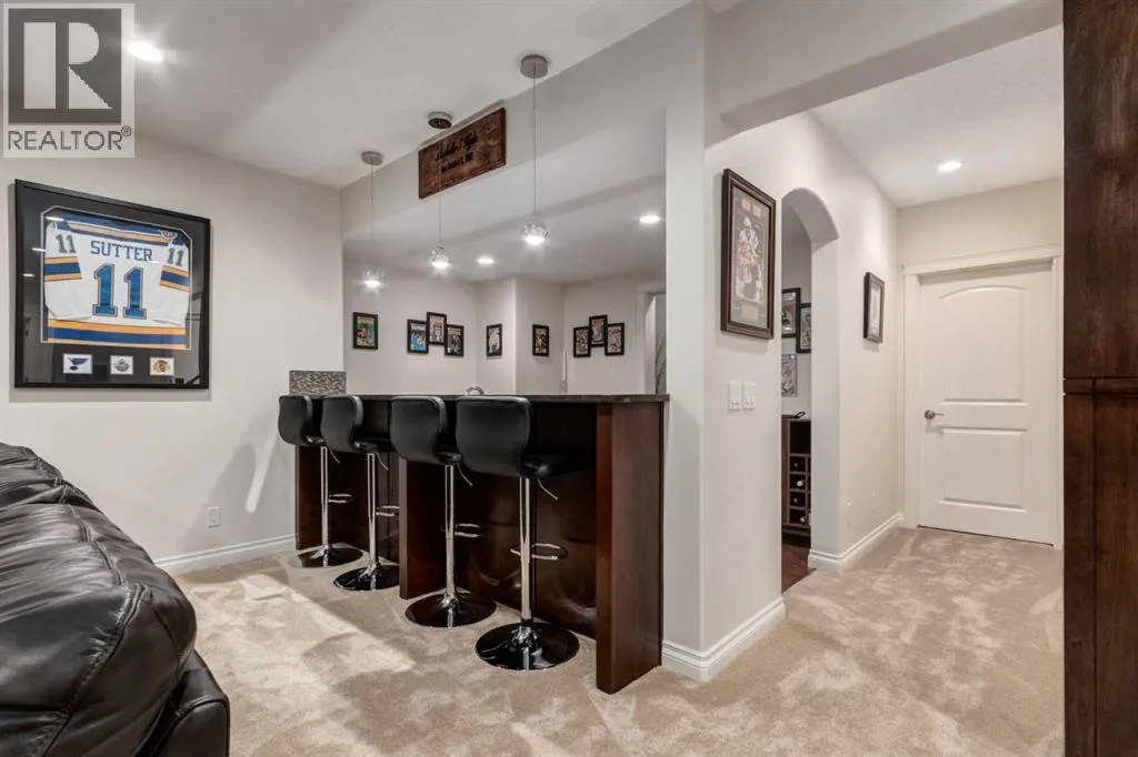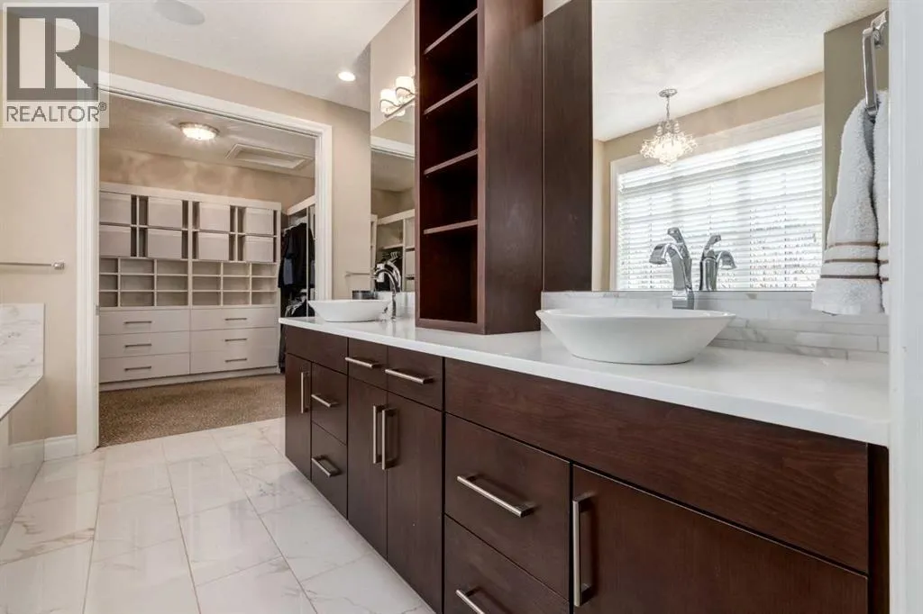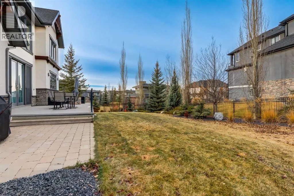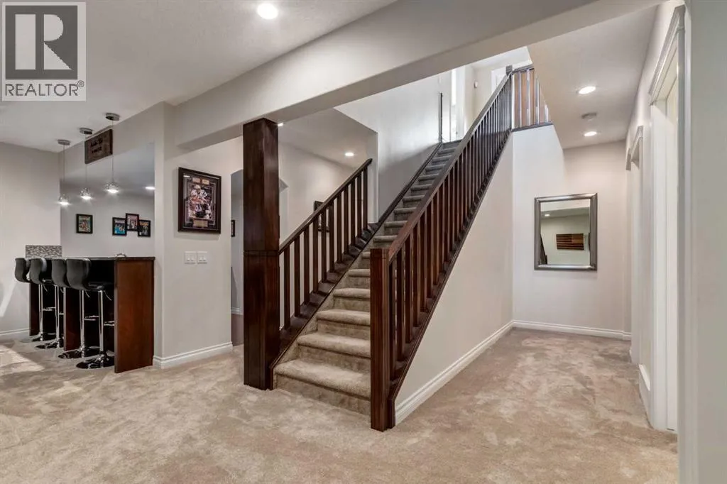 +"PublicRemarks": "Discover unparalleled craftsmanship and modern elegance in this custom built, 6-bedroom, 6-bathroom home, perfectly positioned on a beautifully landscaped corner lot in the prestigious Watermark at Bearspaw community. Designed for luxury living, this remarkable home offers over 5,200 sq.ft. of impeccably finished space across three levels. Step inside and be greeted by 10’ ceilings and an open-concept layout that seamlessly blends comfort and sophistication. The great room is a show piece, featuring a striking floor-to-ceiling tile gas fireplace beneath soaring vaulted ceilings, the perfect setting for gathering and entertaining. The chef-inspired kitchen is a true culinary masterpiece with premium Miele appliances, including a 5-burner gas cooktop, double wall & steam ovens, built-in espresso maker, oversized refrigerator and dishwasher. An expansive quartz island with seating and built-in ceiling speakers make this the heart of the home. A formal dining room with custom quartz serving counter and cabinetry adds both function and flair, while the main-floor primary suite offers a private retreat complete with a spa-inspired ensuite featuring a deep soaker tub, dual vanities with a central tower, and a fully tiled shower with rain and wall heads plus a bench. The spacious walk-in closet is beautifully designed with custom built-ins and ample storage. The main level is complete with a bright front office, a mudroom with built-in lockers for everyday ease, and a convenient main-floor laundry room with generous storage and workspace. Upstairs, a lofted open-to-below bonus area provides a serene space for reading or relaxing. Three generous bedrooms include one with a private ensuite and two share a 5 piece bath, plus a second laundry room for convenience. The fully developed lower level has been beautifully updated with new carpet, paint, and baseboards. Designed for entertainment, this impressive space features a spacious recreation area complete with a full wet bar, wine cellar, and gym, along with a flex room that can serve as a fifth bedroom or media/theatre room, fully wired for surround sound. A sixth bedroom with a private ensuite provides an ideal retreat for guests or extended family. Enjoy outdoor living on the extended 33’ deck with a gas line for BBQ, overlooking your professionally landscaped yard enhanced by over $40,000 in trees, shrubs and rod iron fence. The heated triple garage (36’ x 26’) provides ample space for vehicles and storage. Additional upgrades include a new electrical panel, new hot water tank (2022), new spray foam attic insulation, central A/C, and built-in speakers wired for whole-home entertainment. Experience the best of Watermark at Bearspaw, a serene estate community minutes from Calgary, with scenic paths, waterfalls, and parks. Your piece of paradise awaits! OPEN HOUSE SATURDAY, JANUARY 17, FROM 1-4PM. (id:64429)"