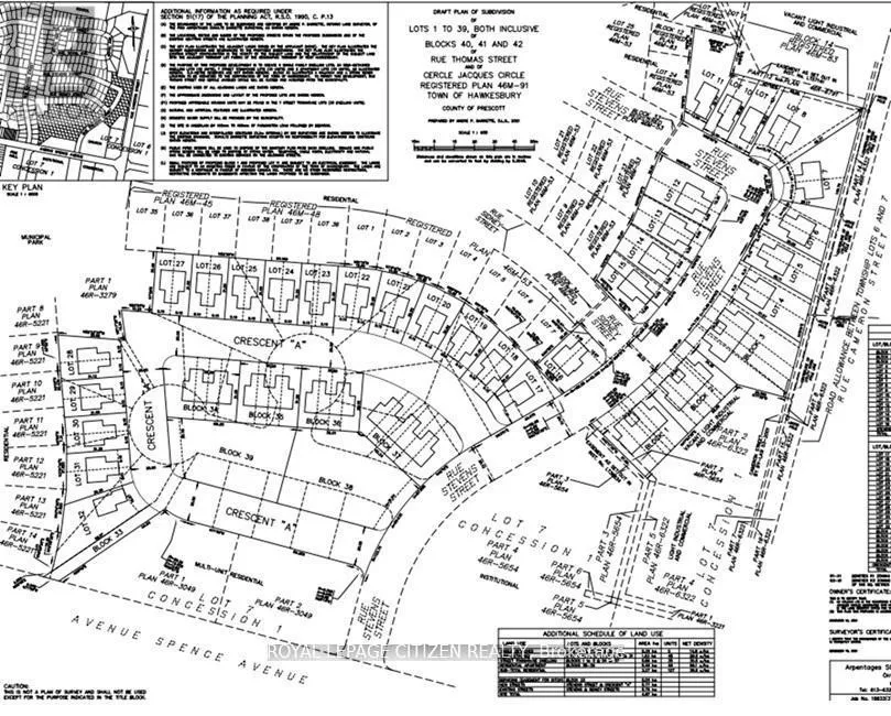 Outstanding opportunity for developers, builders, and investors! An exceptional infill opportunity in the most prestigious Mountrock Neighbourhood in Hawkesbury Town. Approximately 10 acres of subdivision with Municipal Services at the Lot Line (to be extended as part of the site servicing). The Draft plan and Zoning approved for 107 Residential dwelling, combination of 5 Single detached, 48 Semi-Detached, 30 Free