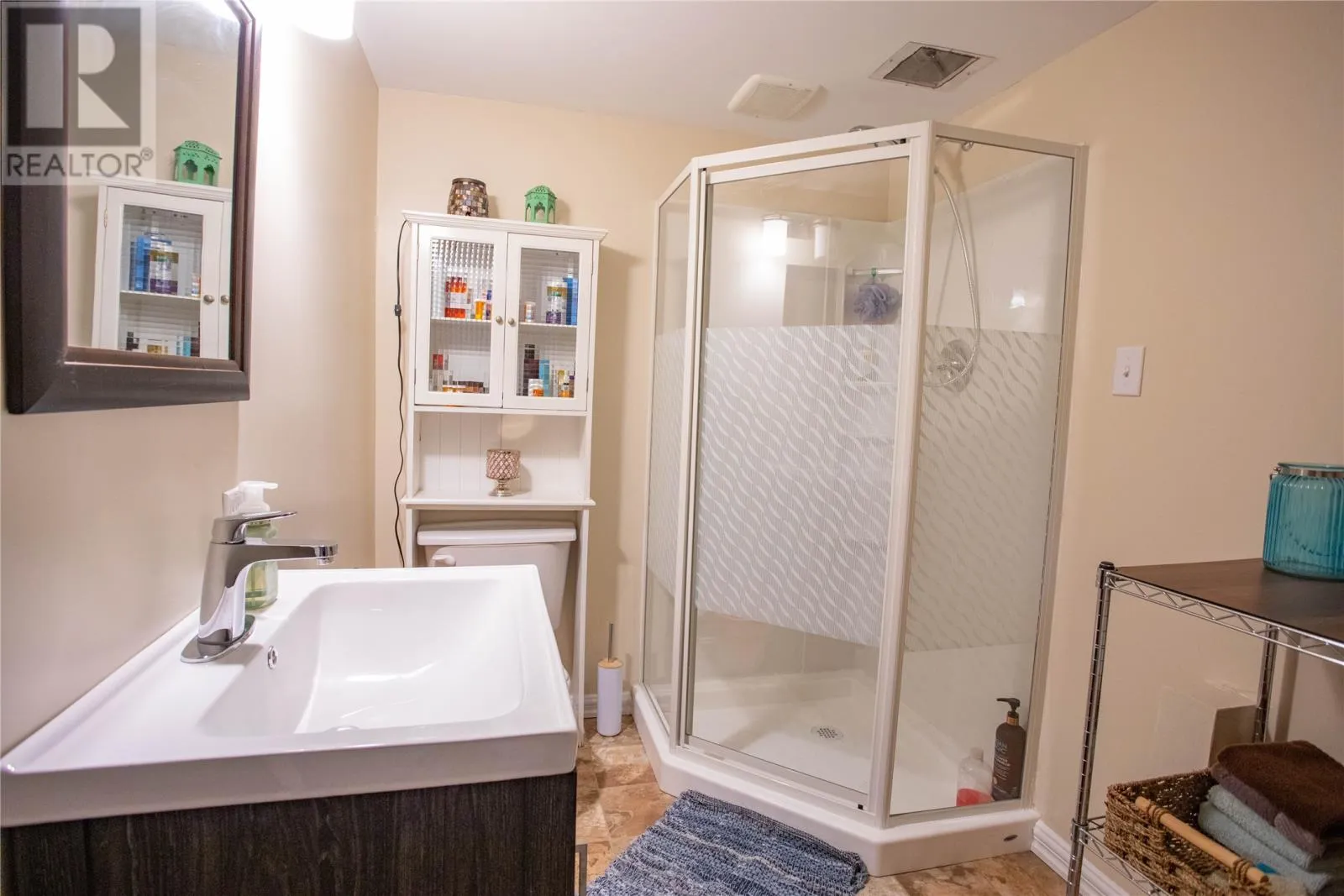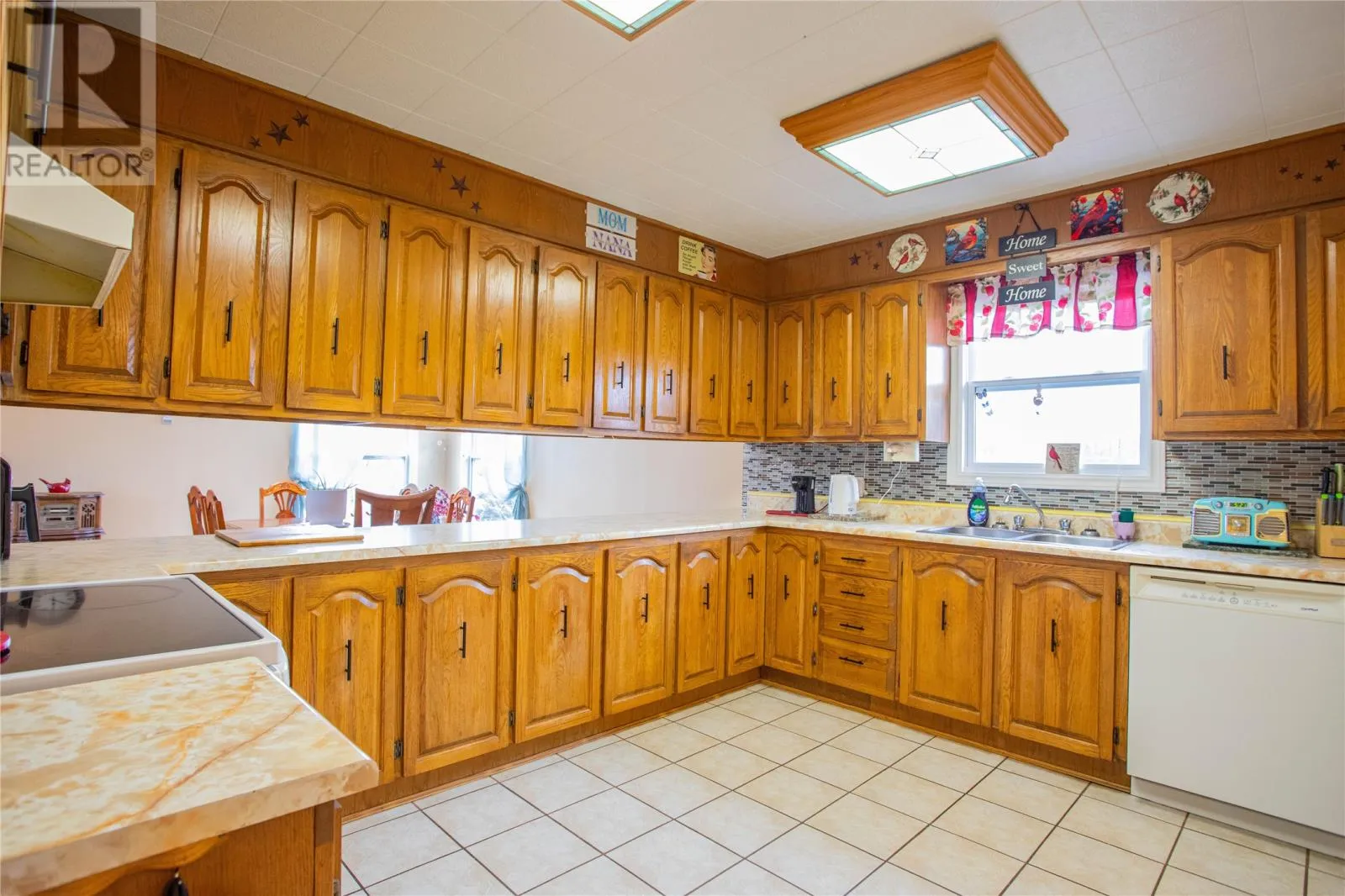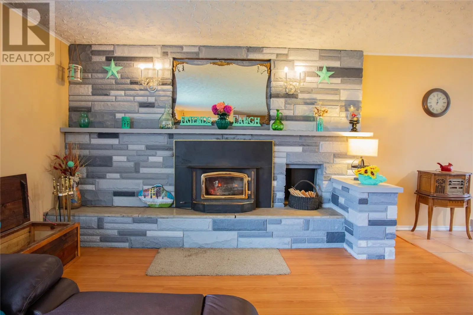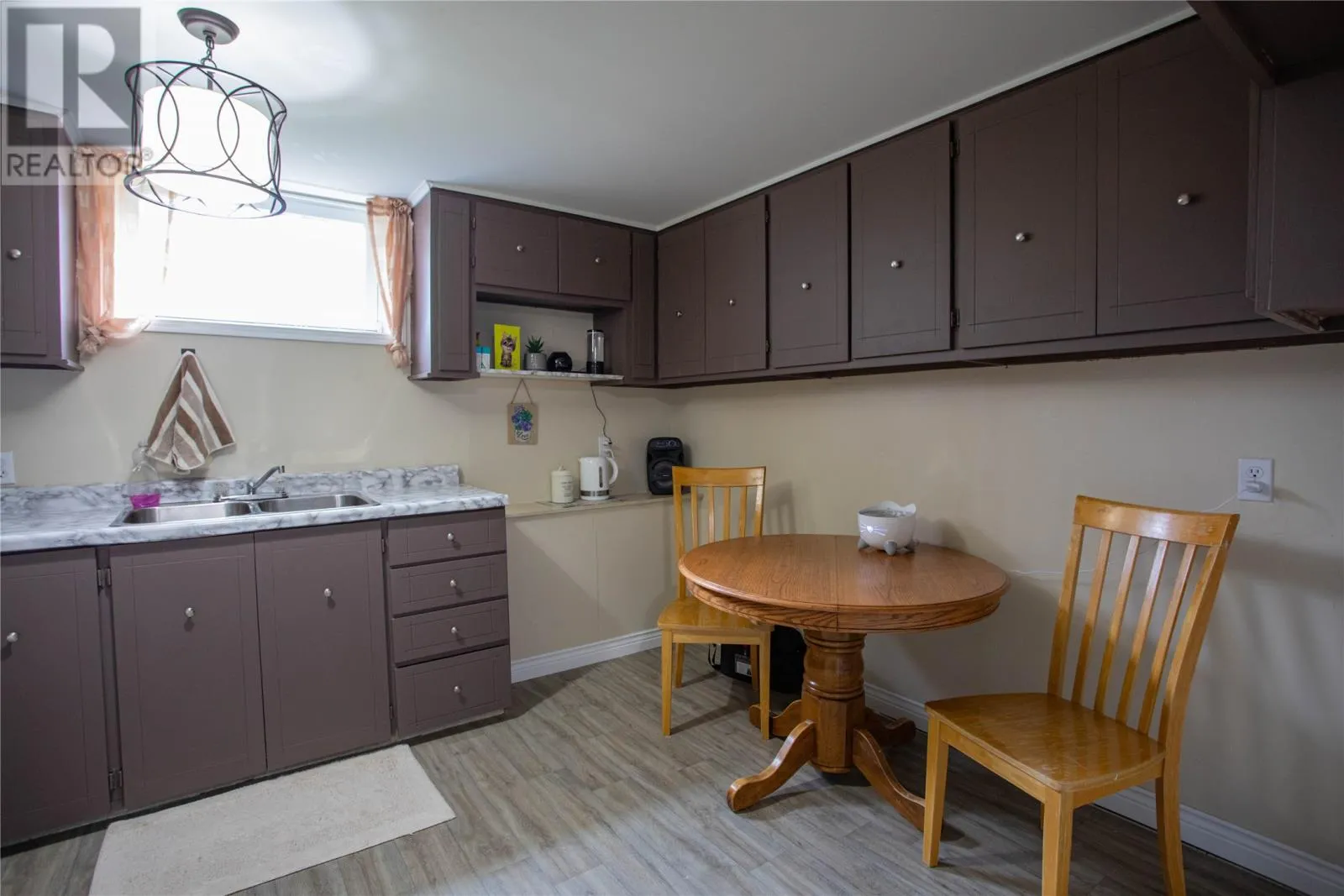9–11 Pondside Road in Spaniard’s Bay is a well-cared-for multi-level home with a lot of living space, two detached garages, and it sits right on the pond. When you come in through the front porch, you walk into a very spacious living room with a lovely wood-burning fireplace, open to the dining area. This level (924 sq. ft.) also has
