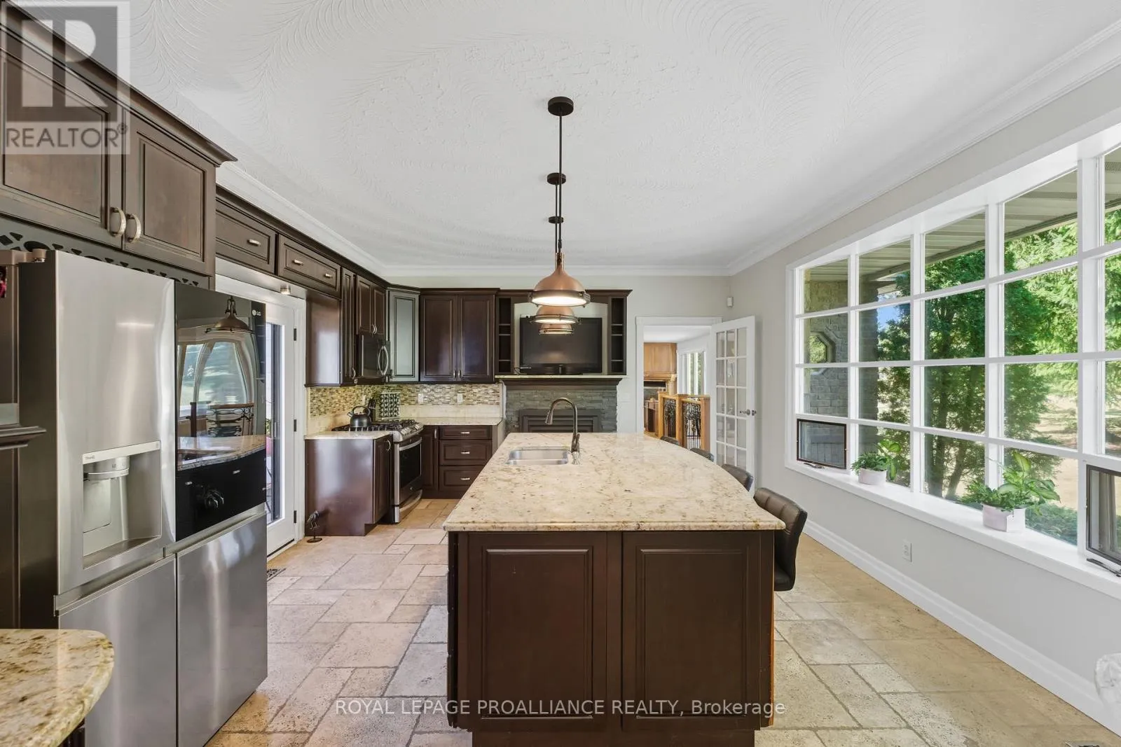 +"PublicRemarks": "This extraordinary 2,584 sq. ft. bungalow is set on a private 1.87-acre lot, offering a rare combination of space, elegance, and lifestyle. The backyard is a true oasis with an inground pool, hot tub, interlock stone patio, Armour stone accents, and an outdoor kitchen an entertainers dream. A winding trail takes you through the trees to a charming bridge over a creek and a sunlit clearing, perfect for gatherings or quiet escapes. Inside, the home showcases high-end finishes including hardwood and travertine flooring, crown moulding, and a thoughtfully designed open layout. At its heart, the gourmet kitchen features a centre island, granite counters, upgraded cabinetry, stainless steel appliances, and a cozy gas fireplace. Sunlight streams through large windows, with a patio door that opens to the deck overlooking the pool and wooded backdrop. Seamlessly connected to the kitchen, the expansive family and dining area offers vaulted ceilings, floor-to-ceiling windows, and a second gas fireplace. This impressive space is ideal for entertaining while maintaining a warm and inviting feel. The bedroom wing includes three generously sized bedrooms and two updated 4-piece baths, each with luxurious finishes. The lower level adds exceptional versatility with a bright living room and walkout to the pool, an additional bedroom, large rec room, office nook, laundry room, and space for a future kitchenette perfect for an in-law suite or multi-generational living. A rare offering that blends elegance, functionality, and resort-style living, this property is truly a must-see. (id:62650)"