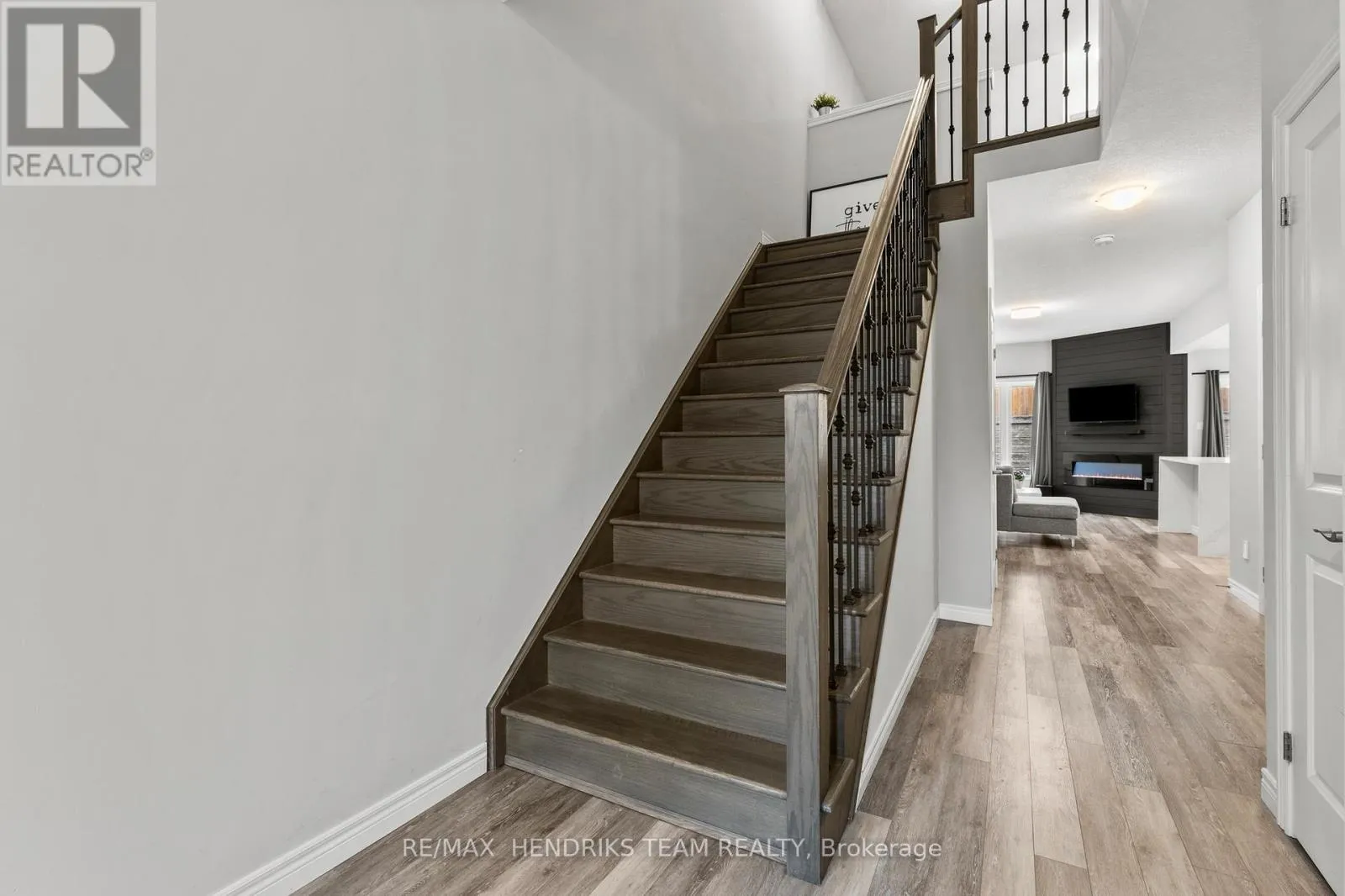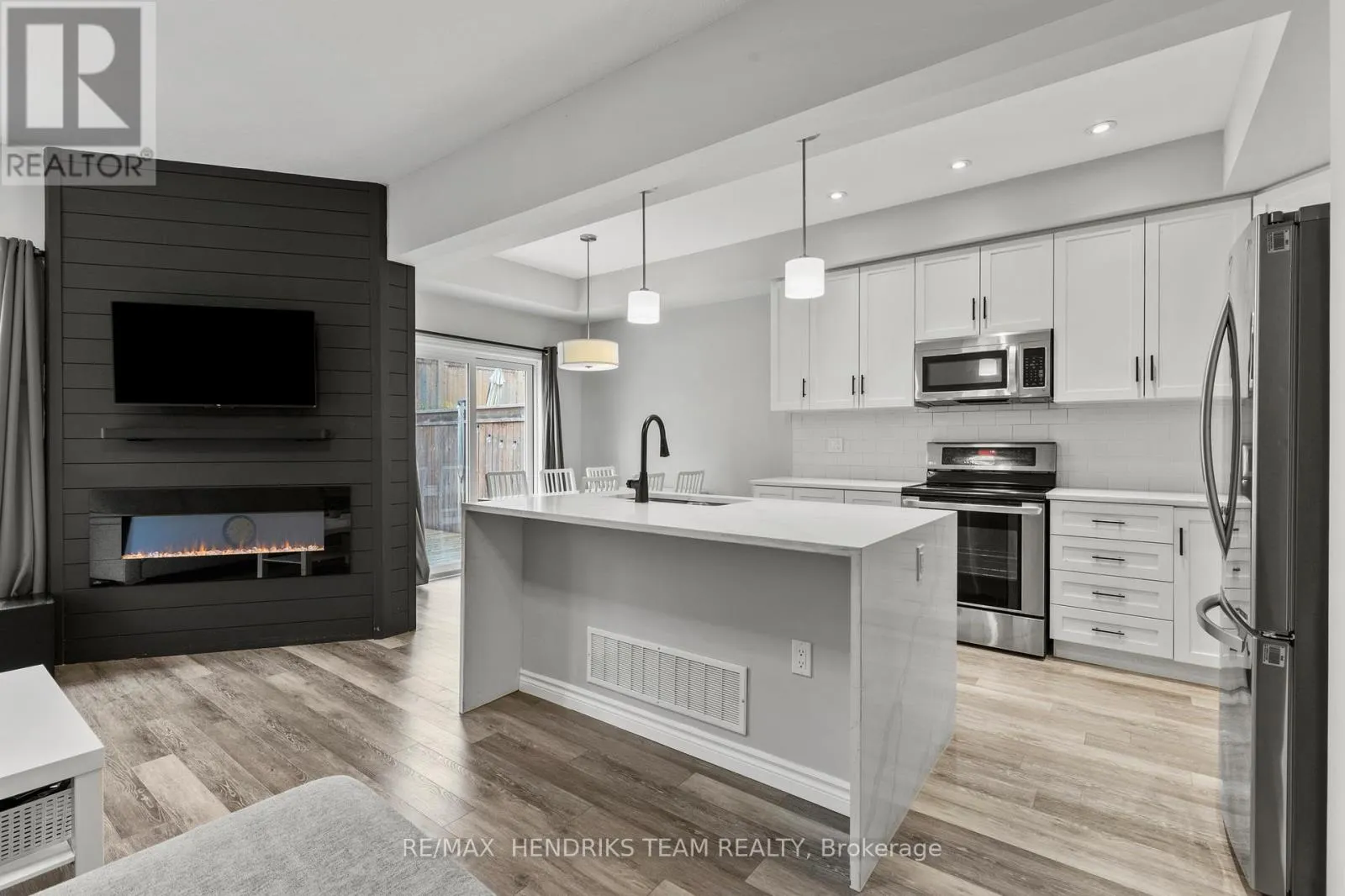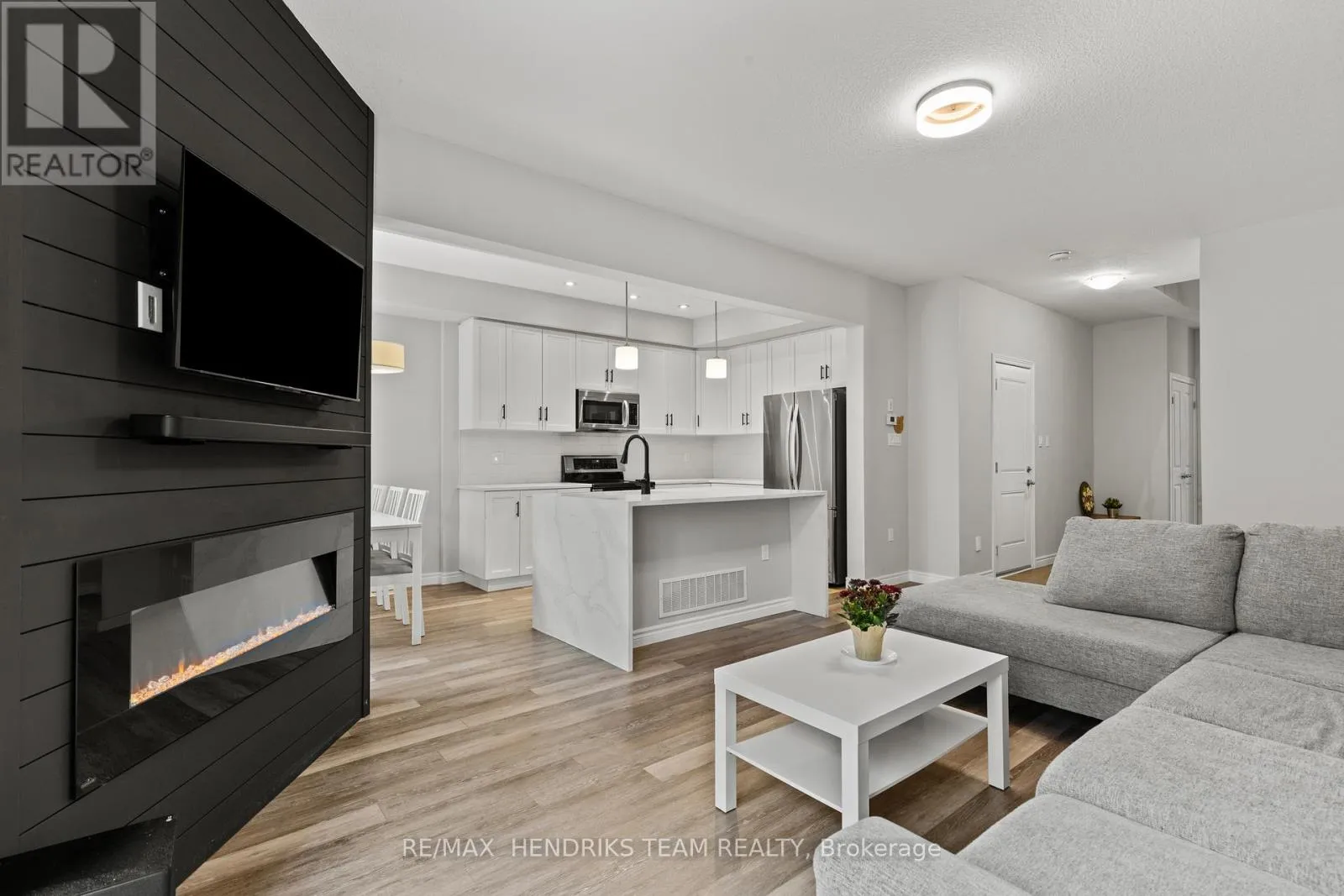 +"PublicRemarks": "Welcome to this beautiful 2-storey townhome in the heart of Smithville! The main floor offers modern vinyl flooring throughout, a convenient powder room, and a stunning custom built-in TV feature wall with an electric fireplace. The contemporary kitchen features quartz countertops with a waterfall edge, stainless steel appliances, and a range microwave. Upgraded oak stairs with sleek steel spindles lead to the second level, where you'll find plush carpeted bedrooms. The spacious primary suite includes a 3-piece ensuite and walk-in closet. Two additional guest bedrooms-each with double closets-are serviced by their own 4-piece bathroom. An unfinished basement provides future potential, while the rear deck offers the perfect space for outdoor entertaining. A must-see home! (id:62650)"