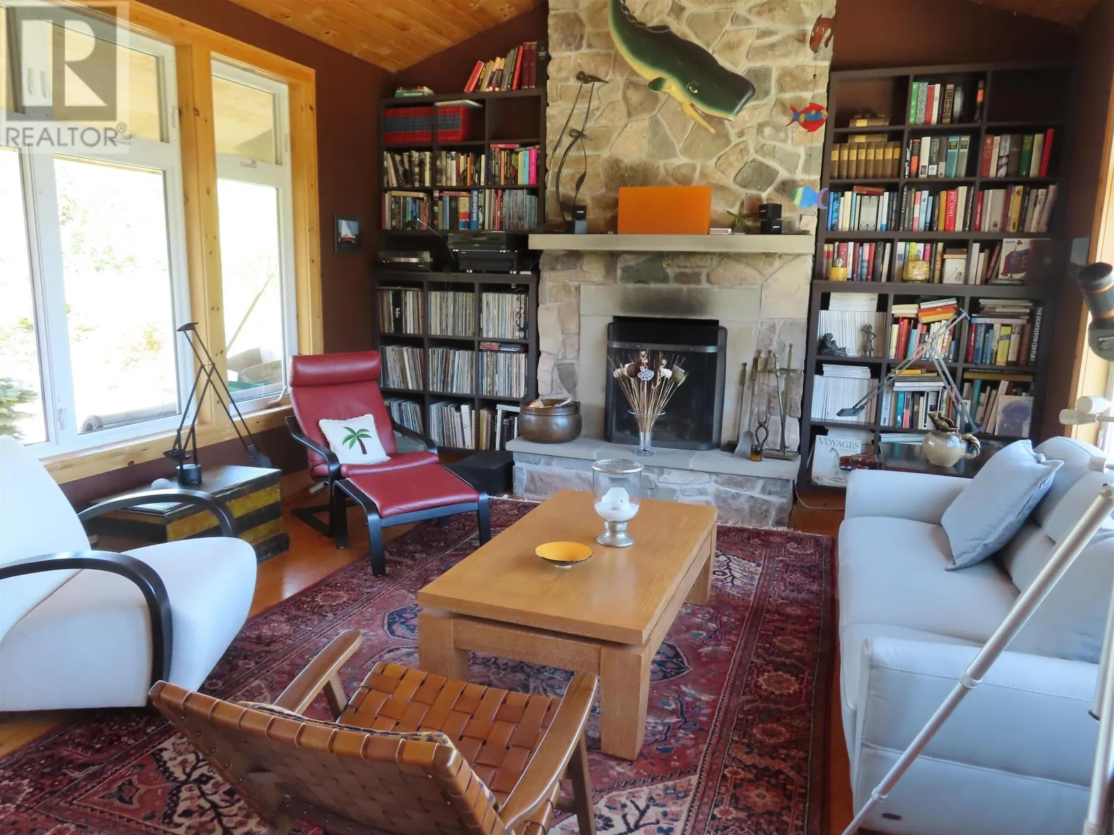 Architecturally designed (architect James Ireland, Toronto) – two bedroom two bathroom cliff side home with water frontage on beautiful St. George’s Bay and views across the bay to Cape Breton and Cape George Lighthouse…spectacular sunrises and moon rises!! the main level has a combined living room with massive stone woodburning fireplace, dining area, galley kitchen and windows all around