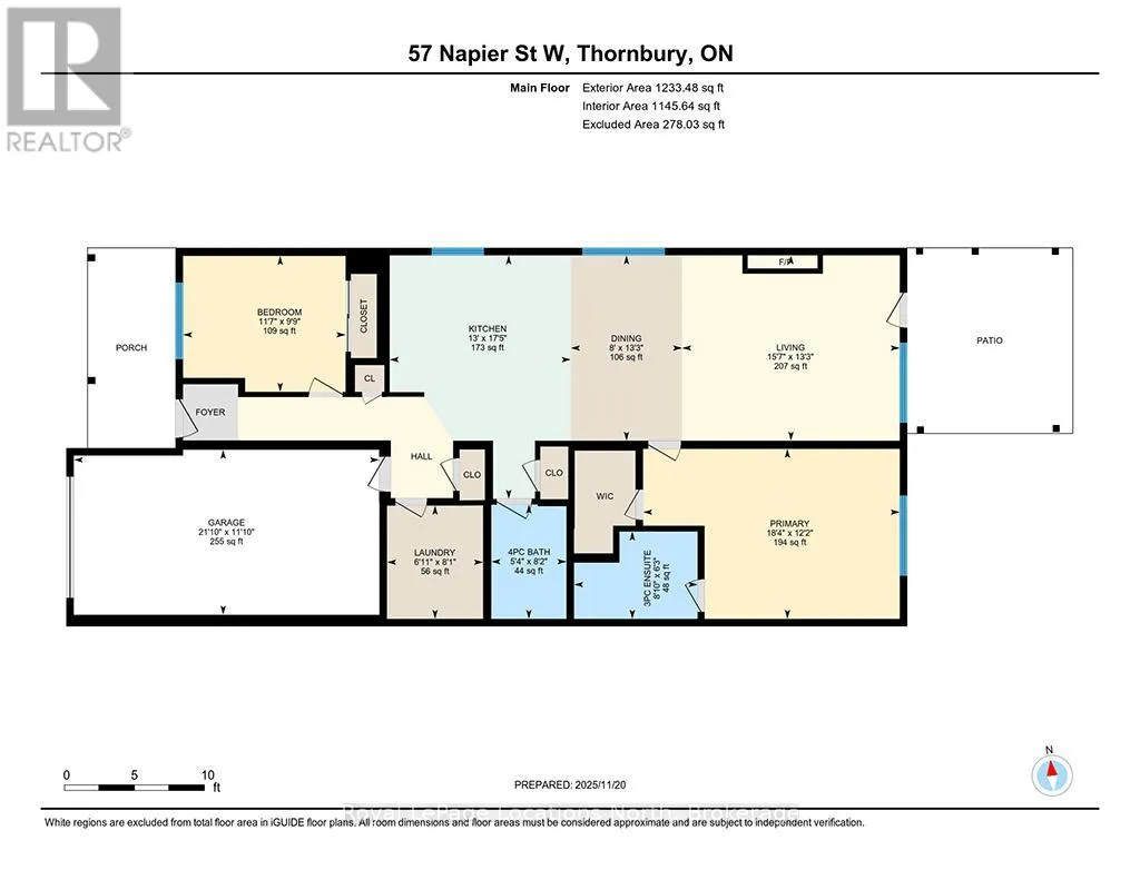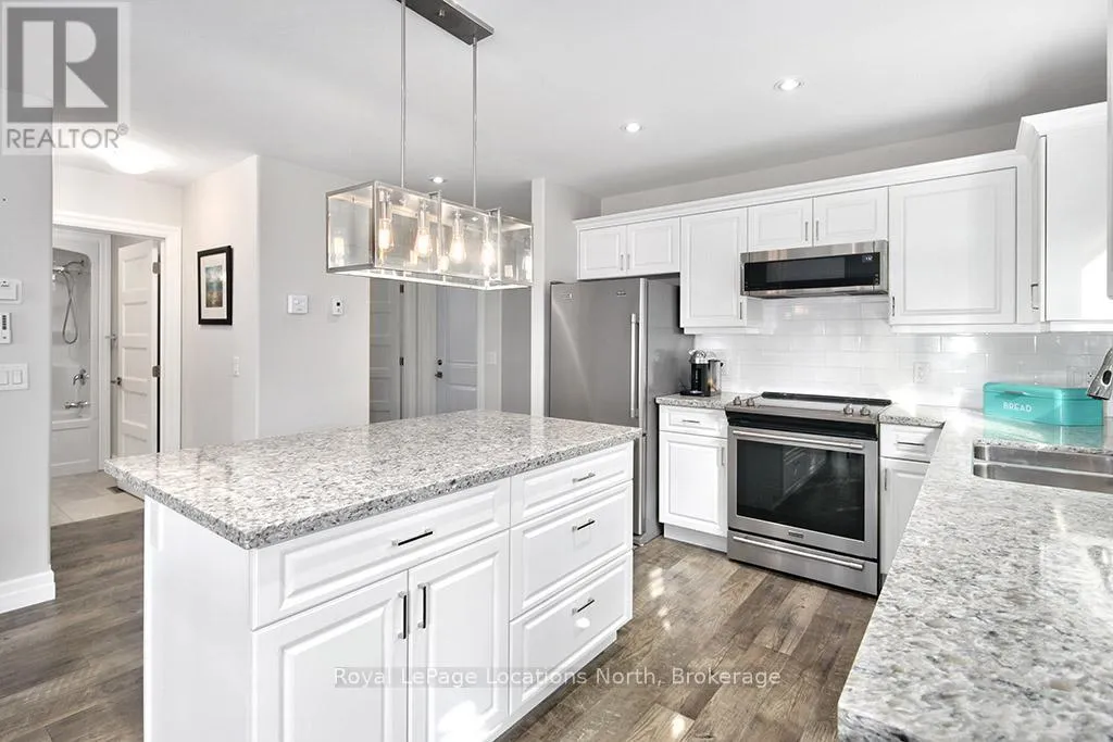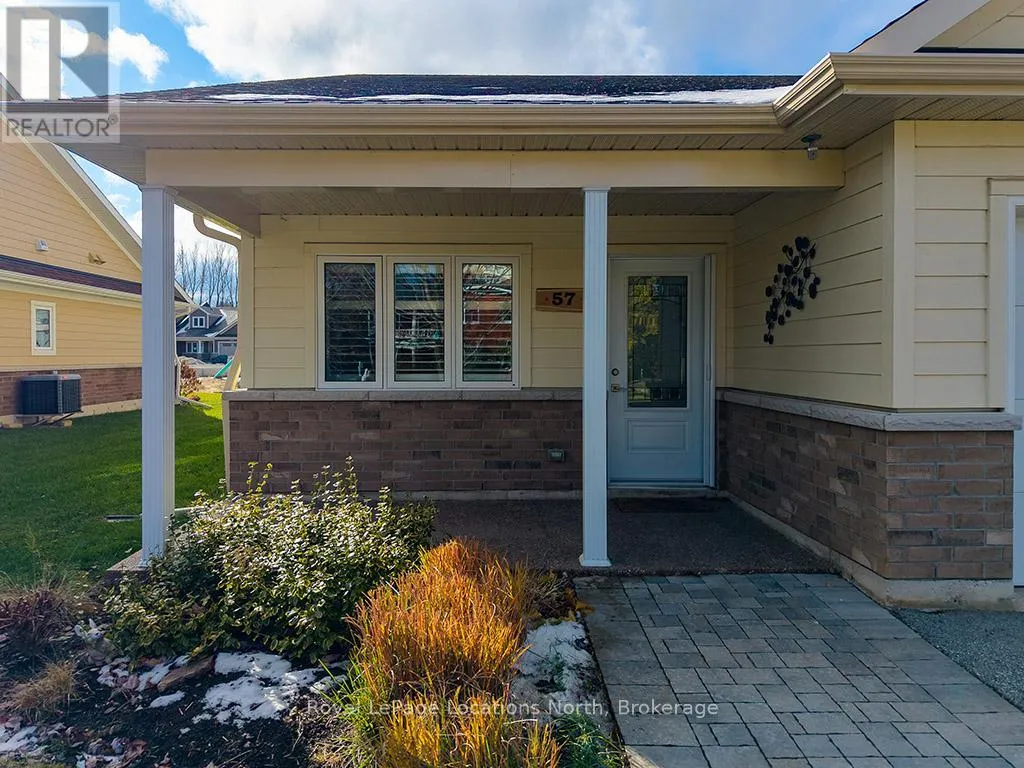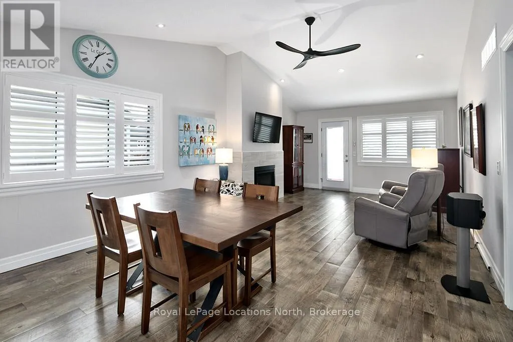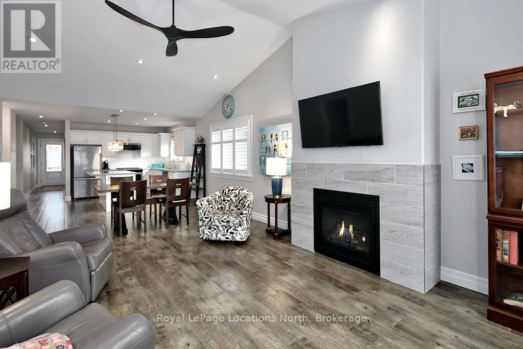 Welcome to Thornbury Meadows, a vibrant 55+ land-lease community where comfort, convenience, and friendly neighbourhood living come together. This beautifully maintained semi-detached 2-bedroom, 2-bathroom bungalow offers 1,233 sq. ft. of well-designed, main-floor living with an airy, open-concept layout and numerous thoughtful features. Inside, vaulted ceilings enhance the bright living and dining areas, anchored by a cozy natural gas fireplace and