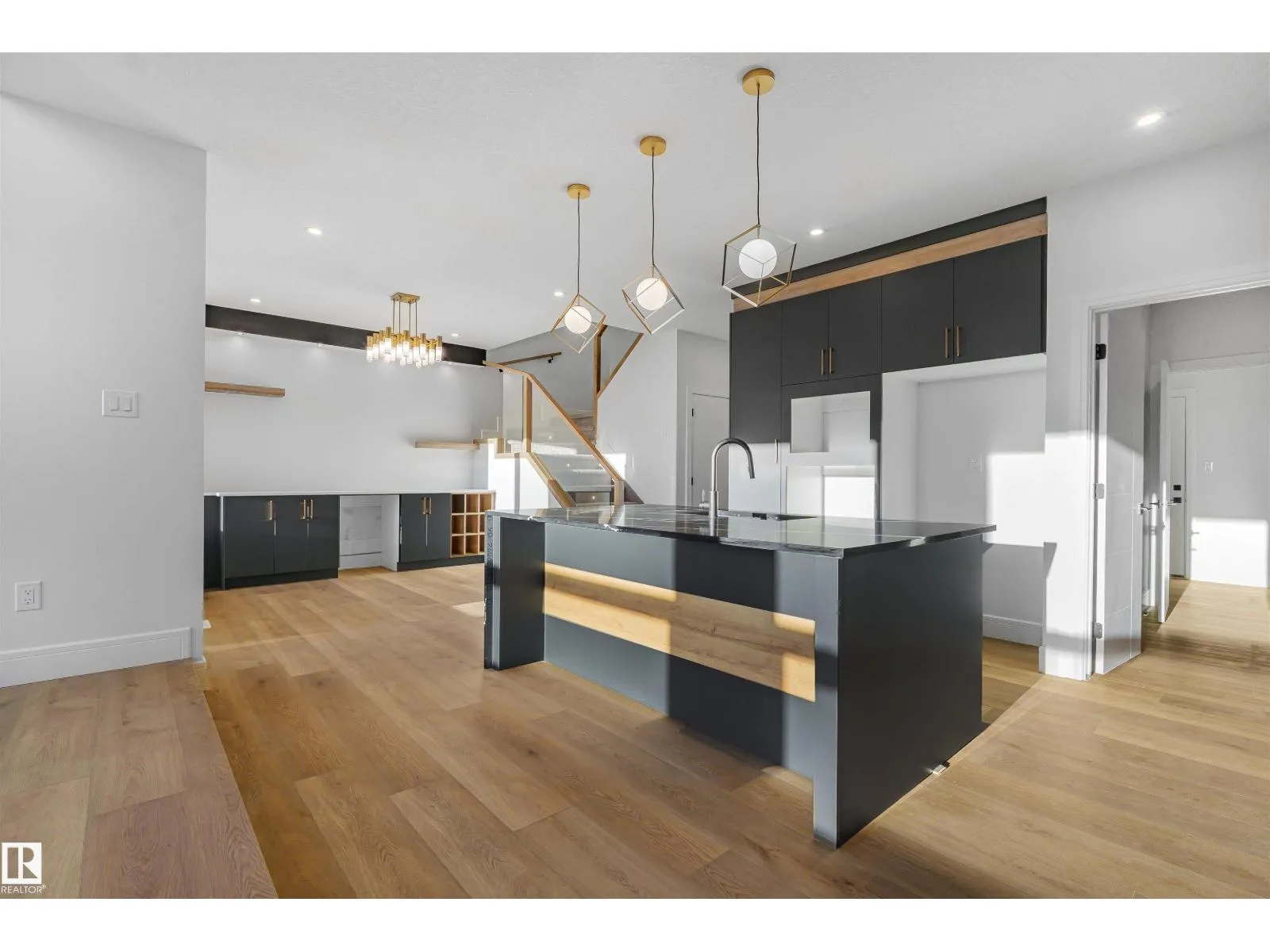 +"PublicRemarks": "Welcome to executive living in Leduc. This Lake view, walk-out bungalow will impress any discriminating buyer. Open floor plan design, formal dining room to celebrate special occasions. Dark hardwood floors lead you to chef's kitchen, full-height espresso cabinets, corner pantry, granite countertops and a spacious serving island. Bright living room, south-facing windows, anchored by a cozy gas fireplace, and plenty of space for comfortable furniture. Direct access to balcony, perfect for enjoying morning coffee or a glass of wine in the sunset. Master bedroom has a walk-in closet, 5-piece spa-like ensuite, glass shower and deep soaker tub for soothing relaxation. The basement was designed for fun and entertaining, corner wet bar, built-in storage benches, room for a pool table or enjoying evening movies. French doors to private office, 3rd bedroom and full bath. Walkout basement opens to 2-tier vinyl deck, ready for next summer's BBQ season. On-demand water, Air and Thermo Drain heat recovery units. (id:62650)"