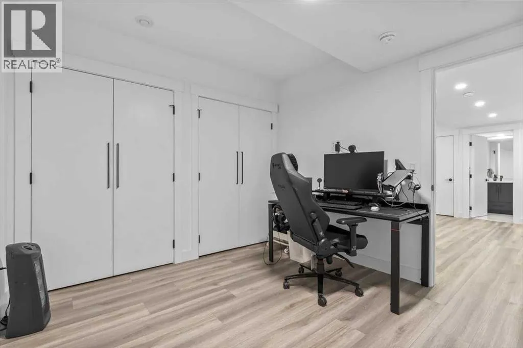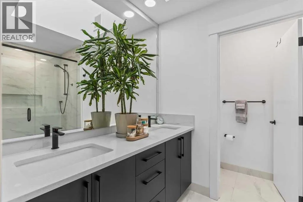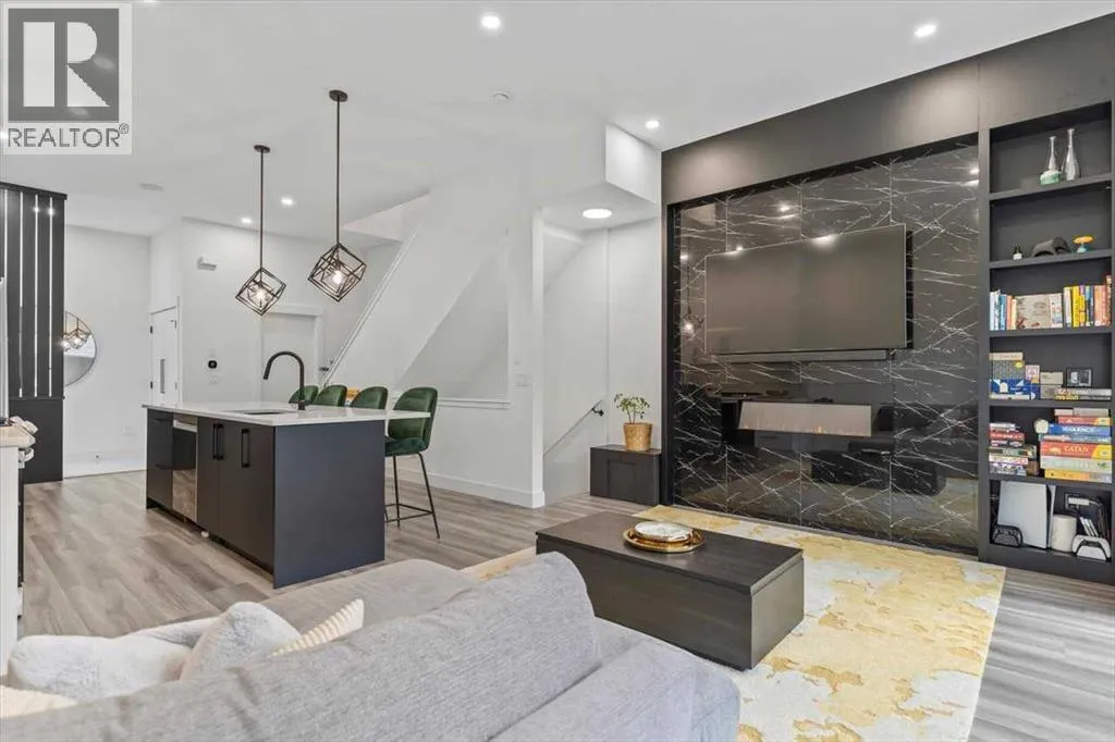 +"PublicRemarks": "---- Open house Sat. Nov. 29 from 1-3 pm -----Welcome to this Immaculate and thoughtfully designed town home in the heart of Marda Loop, over 1,700 sq ft of living space, just minutes away from downtown. Features superior party wall system between units. Main floor showcases 11 ft ceiling, open concept layout, vinyl plank flooring, designer built entry unit. The living room is spacious featuring a wall unit, sleek tile, and a Bluetooth enabled electric fireplace. The kitchen is equally impressive, boasting a large island with quartz counter top, ideal for entertaining, ample soft- close cabinetry, stainless steel appliances. The large south facing sliding door brings in rays of sunshine and light through out the day, tastefully covered with Hunter Douglas honeycomb shades and floor to ceiling blackout drapes for privacy professionally installed by Normandeau, overlookimg a fenced, cozy yard leading to a single detached garage.This floor is completed by a spacious guest half bath. Upstairs, the primary bedroom is a true retreat, with vaulted ceilings, double door his and hers closets, large windows with professionally installed electric blackout honeycomb shades. The barn door leads into a spa-like en-suite with heated flooring, double sink vanity, quartz counters, skylight, oversized tiled shower and dual shower heads. The second large bedroom also has it's own en-suite and skylight, plus manual honeycomb shades. The fully finished basement boasts a bright family/ flex room. A third spacious bedroom with a walk-in closet and a full bath. THIS HOME COMES WITH COUNTLESS UPGRADES- A/C, high efficiency furnace, humidifier, thankless hot water on demand, radon extraction sump pump, built-in speaker system, light dimmers in master bedroom, smart thermostat (ecobee), bathroom fan timers, kitchen and master bedroom lights can be manged through smartphone. This exceptional home offers the best of urban living in an ideal location. This is the one you have been waiting for. Book a showing today. (id:62650)"