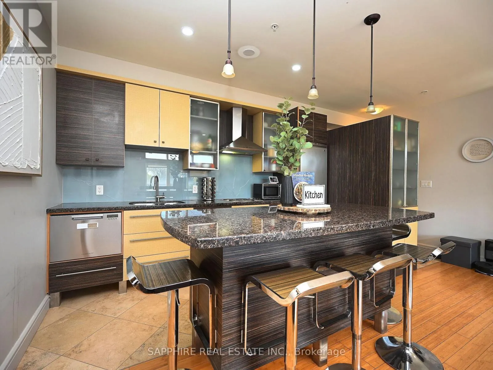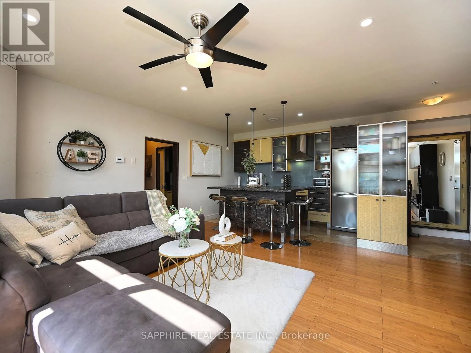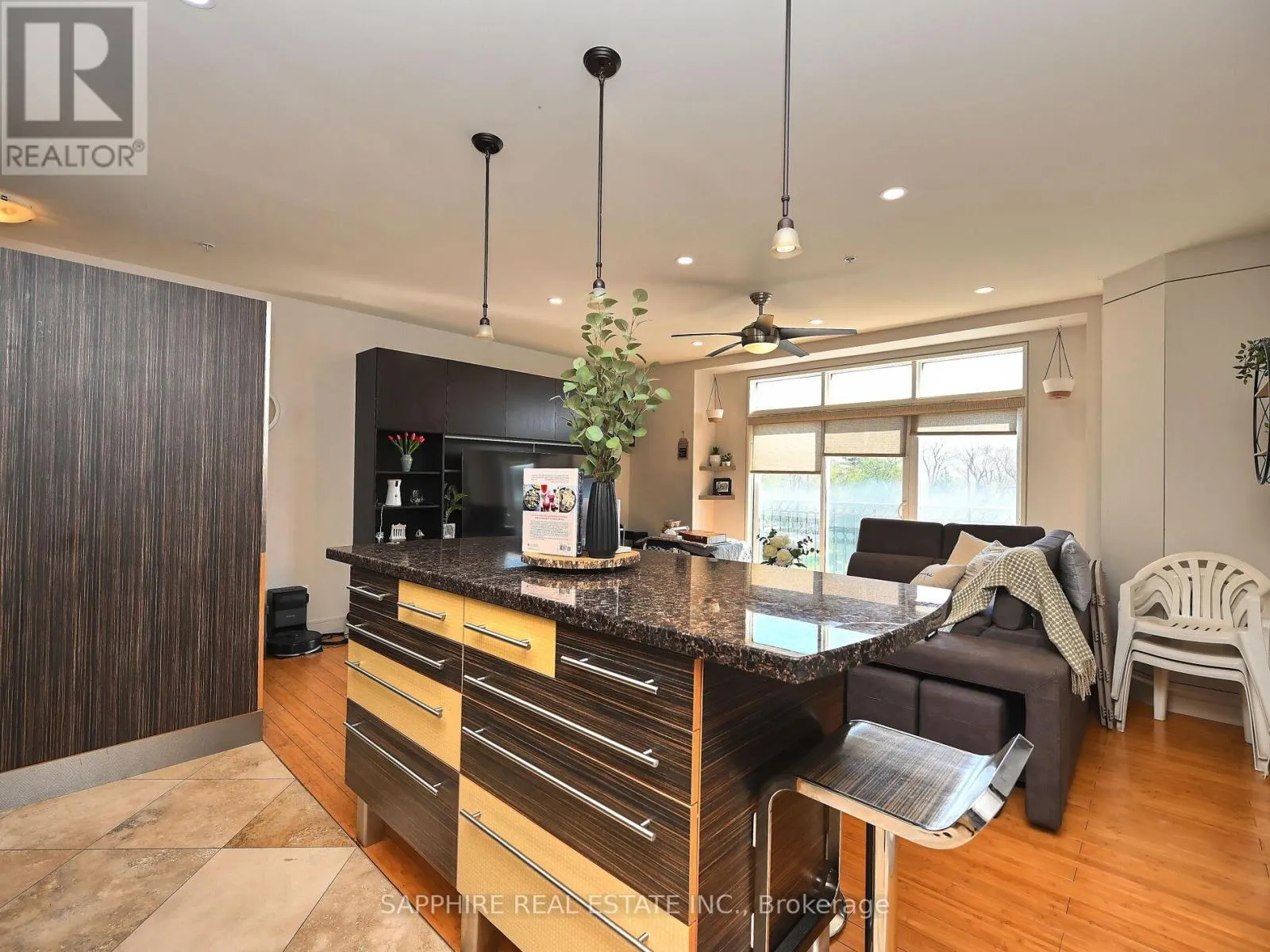 +"PublicRemarks": "Welcome to Kerr Studios, a boutique-style condo community nestled in the heart of vibrant Kerr Village. This meticulously maintained 2-bedroom, 2-bathroom suite offers 900 sq.ft. of bright, open-concept living with ideal bedroom separation each with its own full bathroom perfect for shared living or guests. Overlooking the tranquil, east-facing rear of the building, the unit features high-end bamboo hardwood floors with cork underpadding, granite counters, and a thoughtfully upgraded kitchen boasting 23 drawers, glass cabinetry, a centre island, a European-style brushed steel fridge, built-in cooktop and oven, and a drawer-style dishwasher. The spacious primary bedroom includes an ensuite bath and Juliette balcony. Enjoy smart pot lights, travertine flooring, modern bathrooms with granite walls and glass sinks, custom roller blinds, and large windows throughout. Includes S/S appliances, washer/dryer, window coverings, and one parking spot. Walk to cafes, shops, Oakwood Public School, Tannery Park, Trafalgar Park Community Centre, and the lake. Oakville GO and QEW are minutes away making this a commuters dream. Move-in ready, unpack and enjoy the best of Kerr Village living. (id:62650)"