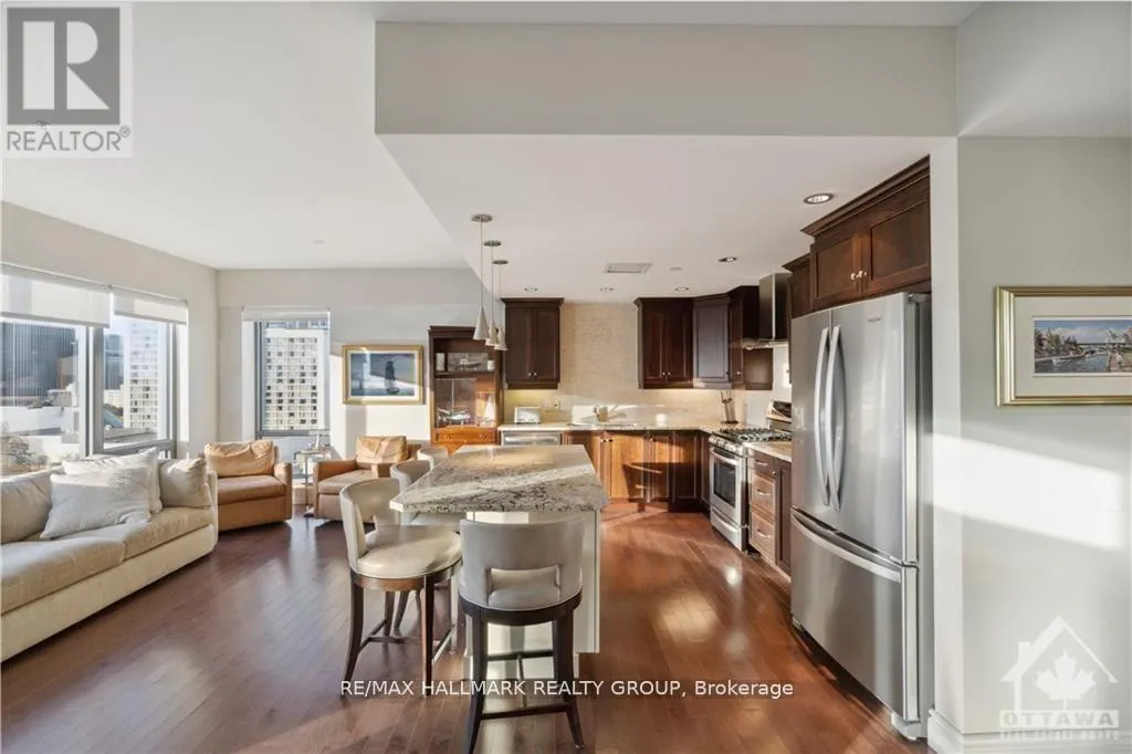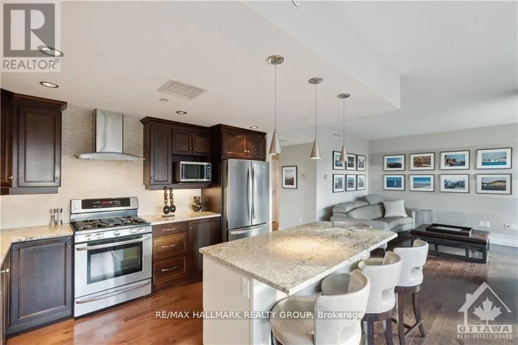 +"PublicRemarks": "Unbeatable value in one of Ottawa's most prestigious addresses-where suites have sold for as high as $2.4M-this impressive 1,276 sq ft luxury residence deserves to be at the top of your list. Perfectly positioned in the heart of the ByWard Market and just steps to majestic Sussex Drive, the National Gallery, museums, and Parliament Hill, this refined condominium offers the ultimate urban lifestyle with unparalleled access to world-class dining, boutiques, entertainment, and cultural landmarks. Bathed in natural light, the well-designed open-concept layout showcases sweeping views from every room, rich maple hardwood flooring, and elegant living/dining spaces that transition beautifully to an oversized balcony. The custom Deslaurier kitchen is a chef's dream, featuring high-end appliances, sleek cabinetry, a stylish island, and gas stove-ideal for gourmet cooking and sophisticated entertaining. The spacious primary suite impresses with floor-to-ceiling windows, a walk-in closet, and a spa-inspired 5-piece ensuite, while the second bedroom offers equally captivating views of the iconic Chateau Laurier. Residents enjoy exceptional amenities including 24/7 security, a state-of-the-art fitness centre, indoor saltwater pool, hot tub, and a beautifully landscaped rooftop terrace. Parking Unit 39 Level B and Locker Unit 90 Level B are included, along with all appliances, window blinds, washer, dryer, microwave/hood fan, refrigerator, stove, dishwasher, gas stove(s), and automatic garage door opener. Special assessment has been paid by the Seller. Rentals: none. Currently tenanted until end of August 2026. Schedule B must accompany all offers. 24 hours irrevocable on all offers. (id:62650)"