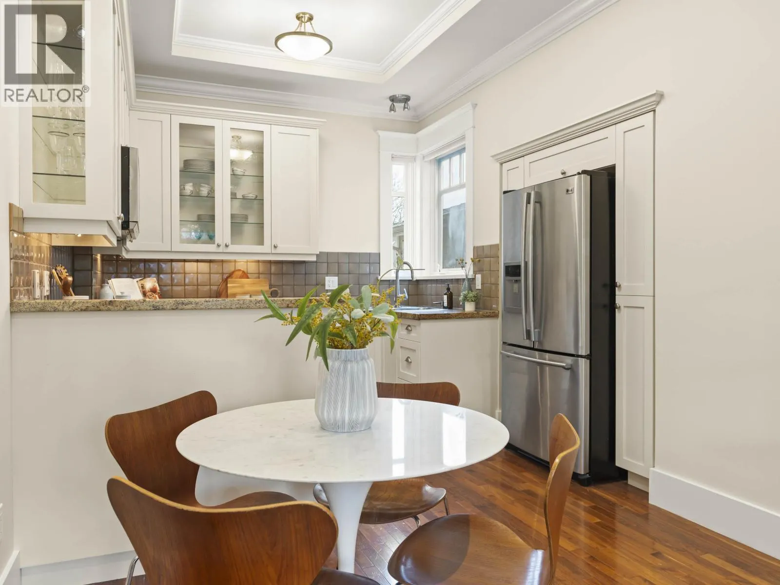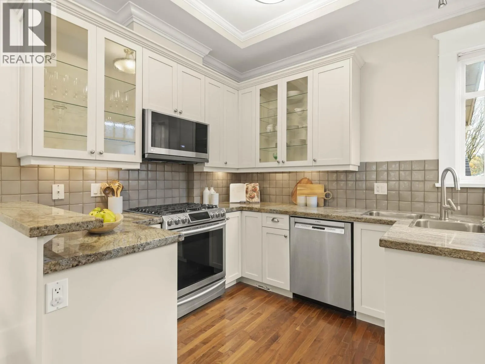 +"PublicRemarks": "Beautiful Kitsilano craftsman-style 2-level home blending heritage charm with modern updates. Features 9'-12' vaulted ceilings, crown moulding, maple/cherry hardwood floors, vented skylights and a cozy gas fireplace. Updated kitchen with refinished cabinets, granite counters, Samsung gas stove and upgraded appliances. Two bedrooms each with full ensuites plus a handy workspace nook. Enjoy in-floor geothermal radiant heat, built-in speakers, fresh paint and upgraded lighting. Landscaped gardens, private parking pad and an unbeatable walkable location close to schools, parks, shops, transit and the beach. Minutes to UBC and downtown. (id:62650)"