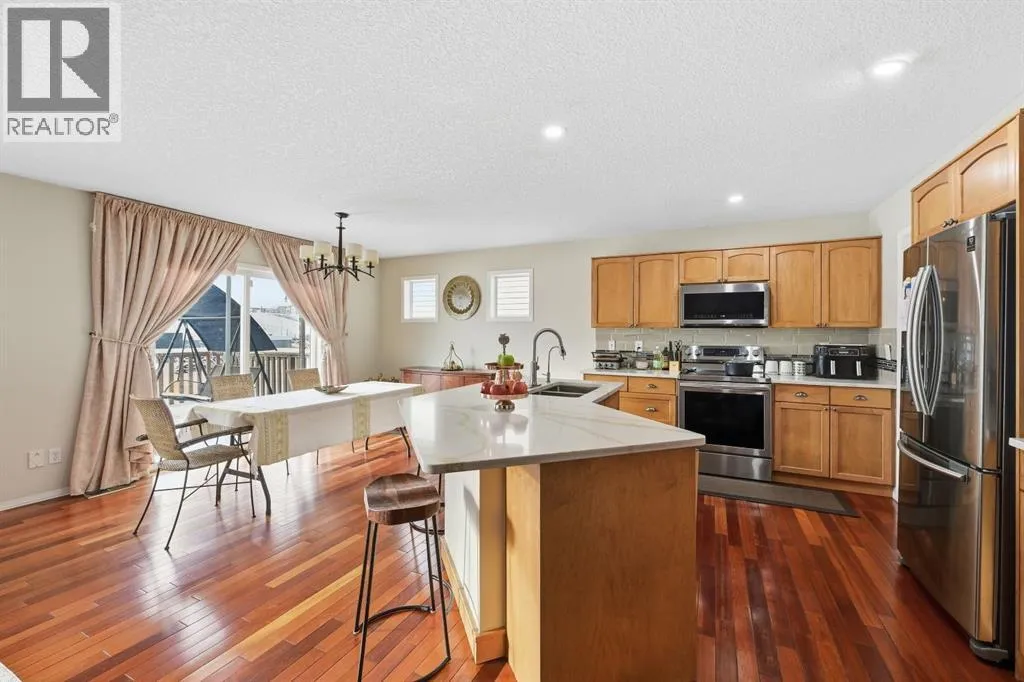 +"PublicRemarks": "Welcome to this gorgeous family home located in the desirable community of Evanston, just steps from reputable schools, parks, playgrounds, public transit, restaurants, and many amenities. The main floor showcases a bright, open-concept design, maximizing natural light and is perfect for daily living and entertaining. The Chef's appointed executive kitchen is equipped with granite countertops, upgraded stainless steel appliances including 36" gas cooktop, chimney hood fan and built in oven and microwave, modern full height cabinetry with tons of granite counter top and work space, many drawers and a convenient huge walkthrough pantry with direct access from the garage. Adjacent to the dining area, sliding doors lead to the upper deck and down to a lower backyard patio, perfect for outdoor gatherings and relaxation. The spacious Livingroom showcases a elegant fireplace with designer tile and a wood mantle and a huge window so you can enjoy lots of natural light and overlook the rear yard.Upstairs, a versatile central bonus room, open to the staircase with window provides space for family activities and children’s play area. The primary bedroom offers a five-piece ensuite with soaker tub and separate full size walk in shower and an extensive vanity with granite counter top with double sinks, and a bank of drawers plus a walk-in closet. Two additional bedrooms and a full bathroom accommodate guests or family members. Laundry facilities, with full size washer and dryer, is conveniently located on the upper level. Central air conditioning and a full solar system was installed in 2024 allowing for substantial energy saving benefits and as well there is an EV outlet in the double detached garage.The undeveloped basement presents many opportunities for completion, like an additional bedroom and recreation room and a full bathroom, plus lots of storage. Nearby amenities include Kenneth D. Taylor School, Our Lady of Grace School, Evanston Towne Centre, local parks, walking paths, and transit options. Notably, a new middle school and elementary school are under development within walking distance. Residents benefit from quick access to Stoney Trail, Nose Hill Park, and shopping at Creekside and Sage Hill Plaza. Recent improvements include replacement of roof shingles in 2024. For more information or to book a showing please contact us! (id:62650)"