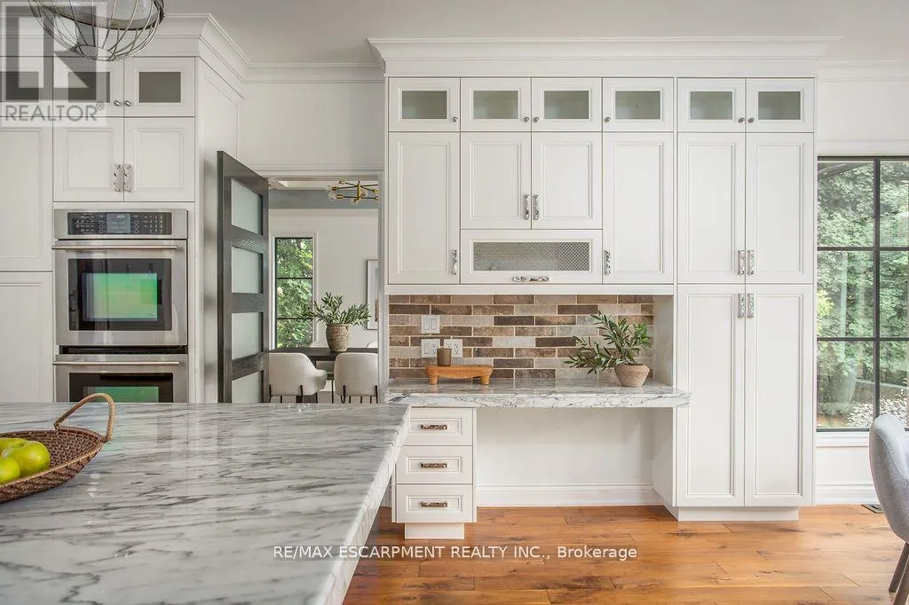 +"PublicRemarks": "Welcome to 20 Meander Close-an exceptional custom-built bungalow nestled on a quiet, highly sought-after street in the heart of charming Carlisle. This beautifully maintained home sits on a picturesque ½-acre lot backing onto serene green space, offering privacy, tranquility, and a true resort lifestyle. Step inside to discover a warm and inviting interior filled with natural light and elegant details. The spacious family and living rooms feature hardwood floors, a cozy gas fp, California shutters, high ceilings, and French doors opening to the backyard oasis. A separate formal dining room overlooks the pool and gardens perfect for family gatherings or entertaining friends. The kitchen will delight the chef of the family, showcasing quartz countertops, double ovens, a gas cooktop, farmhouse double sink, and abundant cabinetry with pull-out drawers and a convenient pantry. A sunroom & mudroom add everyday function and charm. The primary suite offers a peaceful retreat with a walk-in closet, 3-pc ensuite, French doors to a private patio, and an electric fp for year-round comfort. Two additional bedrooms and a 4-pc and 2-pc bath complete the main level. Downstairs, the fully finished basement extends the living space with a rec room, wet bar, family room, playroom/office, laundry area, generous storage and another bedroom, ideal for a growing family or hosting guests. Outside, the magic continues! Enjoy the heated inground saltwater pool, newly updated flagstone surround (2024), refurbished cabana (2021), interlock patios, and lush mature trees for ultimate privacy. The removable pool safety fence (2018) provides peace of mind for families with young children. The irrigation system keeps the grounds lush and green all summer long. Enjoy all that Carlisle has to offer! Close to local parks, schools, skating rinks, trails, golf courses, shops, & the library all while being just minutes from major highways. Country charm meets modern convenience at 20 Meander Close! (id:62650)"