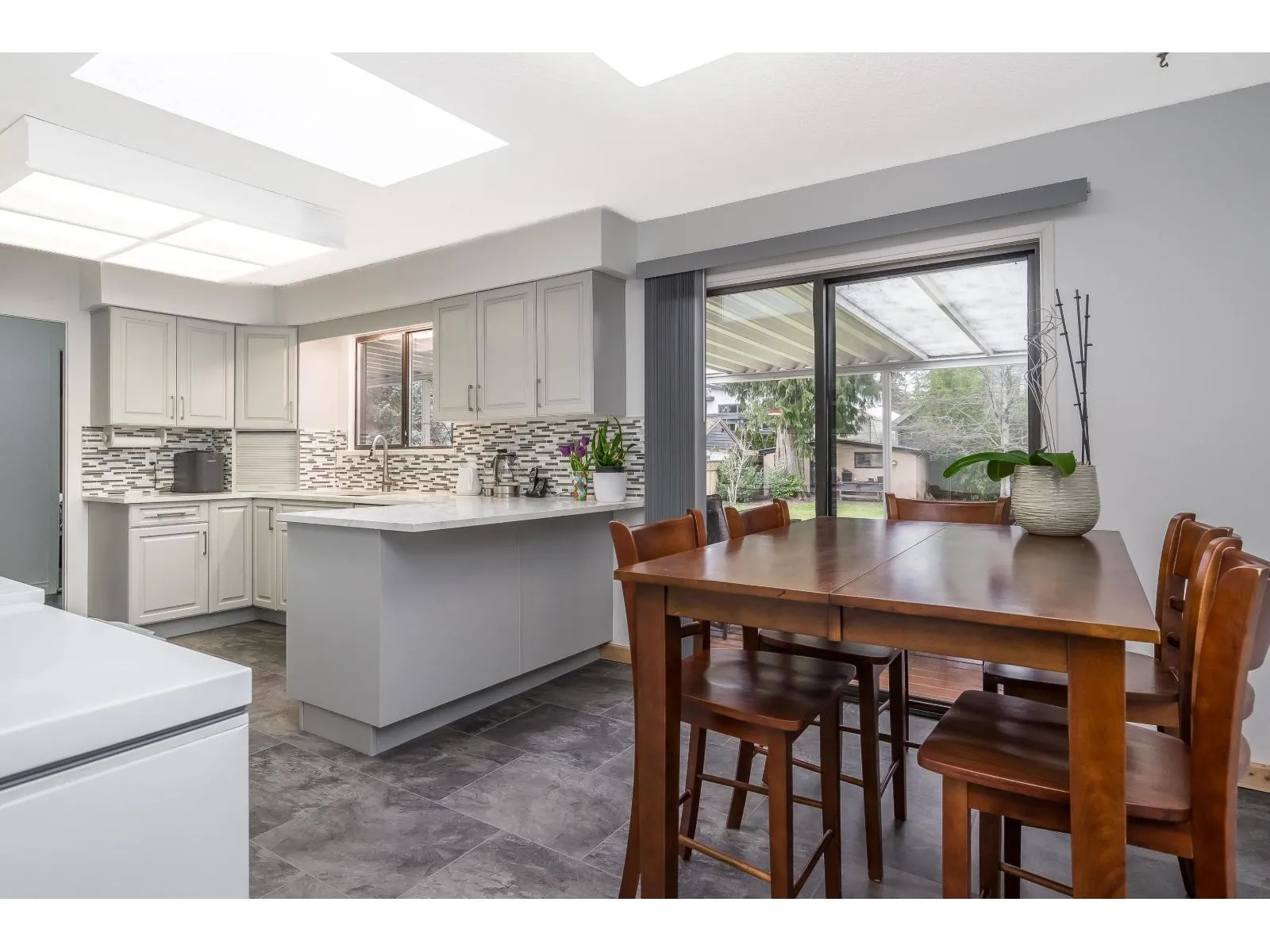+"PublicRemarks": "Discover this beautifully updated split-level home in Brookswood Area, showcasing a striking white-on-black design. Enjoy new vinyl siding and energy-efficient double-pane windows throughout.Inside, the spacious living area features updated engineered flooring and a cozy fireplace. The chef's kitchen boasts butcher block countertops, stainless steel appliances, and soft-close cabinets with slide-out drawers. The updated laundry room, with stylish mosaic floor coverings, seamlessly connects to the expansive outdoor space. Step outside to over 350 square feet of deck, perfect for entertaining and enjoying the landscaped yard and BBQ area wired for TV. With two gas fireplaces, an AC Honeywell home system, and a double car garage, this home combines modern comfort with inviting charm. (id:62650)"
