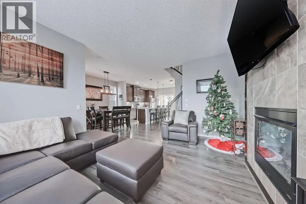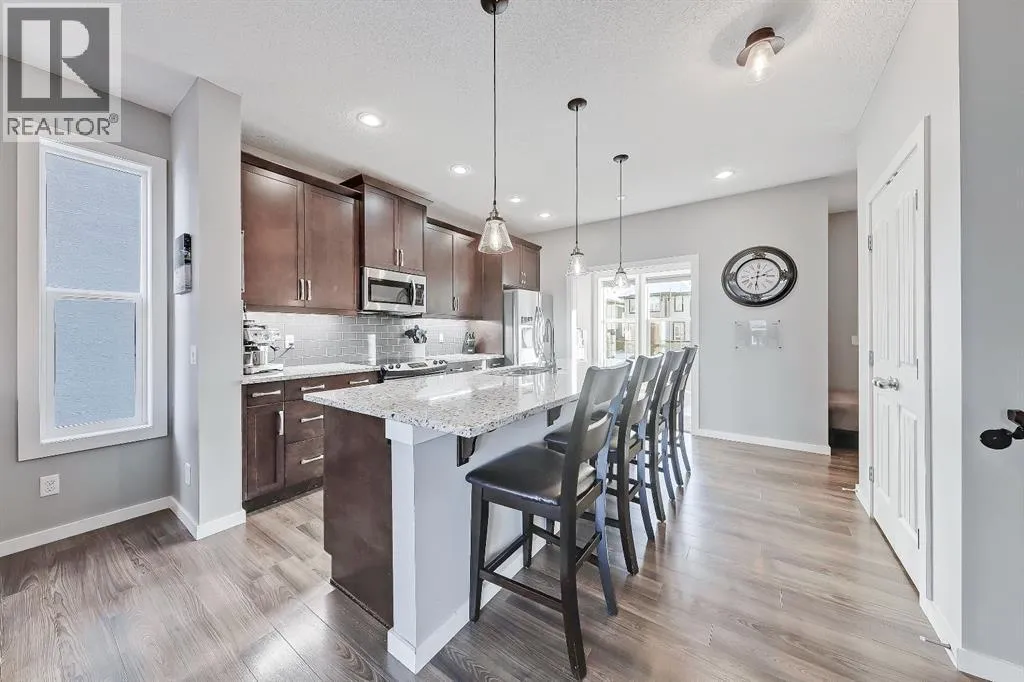 +"PublicRemarks": "Charm meets convenience in this well-maintained two-storey detached home in Mahogany, offering nearly 1,700 sq. ft above-grade space. In this award-winning 4-Season lake community, residents enjoy exclusive access to 63 acres of water, private beaches, a kids' splash park, 22km of pathway & 74 acres of restored wetlands. Inside, a bright foyer with a convenient front closet and very discreet powder room leads into the open-concept main floor. This sought-after central kitchen design offers stainless steel appliances, a central island with bar seating, granite countertops, a tiled backsplash, ample cabinetry, and generous prep space. A cozy, carpeted den, just off the dining area, complete with large windows and built-in shelving, creates a versatile space for a home office, with enough room for both partners to work from home or use it as a playroom, study nook, or reading spot. The living area is filled with natural light thanks to the oversized windows and features a gas fireplace framed with tile and custom wood detailing. The large mud room is perfect for kids loading and unloading from the oversize deck and garage. This home also includes central A/C for year-round comfort. Upstairs, the primary suite offers a peaceful retreat with a large walk-in closet and a spa-inspired 5-piece ensuite featuring dual sinks with granite countertops, a soaker tub, and a tiled walk-in shower. Two additional bedrooms, a 4-piece bathroom, and a dedicated laundry room with storage space for cleaning supplies complete the upper level. The fully custom-designed and developed basement adds even more living space, including a spacious rec room with a cozy fireplace, an extended wet bar with quartz counters and a brand-new full-size fridge, a comfortable 4th bedroom, and a modern 3-piece bathroom. This $40,000 development also included ceiling sound bars for enhanced sound mitigation. The basement is fully insulated and features abundant storage, including large storage rooms ideal for seasonal items, gear, and household extras. Outside, enjoy an amazing backyard on the street's largest lot, with no neighbours behind you, featuring a large deck, a storage shed, plenty of space to relax, play, or garden, and a nearly 550 sq. ft. double detached garage offering insulated, heated parking and additional storage. The garage is oversized with a valued section perfect for bikes, tools, or game meat. The paved back lane keeps vehicles and garage floors cleaner year-round. The exterior also features Gemstone lights for customizable seasonal lighting. Set in Mahogany, one of Calgary’s most desirable lake communities, this home is close to parks, pathways, shops, dining, and year-round recreation. This is a perfect opportunity to own a warm, welcoming home in a vibrant neighbourhood. (id:62650)"