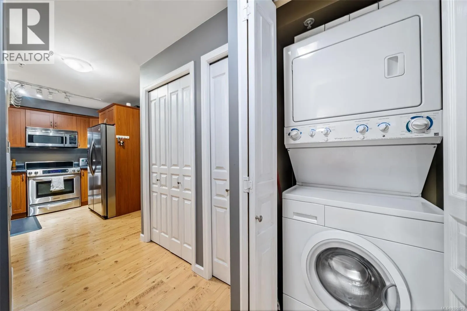 +"PublicRemarks": "Welcome to Casa Bella an exquisitely designed building in the heart of Beautiful Langford. Bella Vista is set back in an enclave well off of the main roads. 2 dogs or cats allowed and no size restriction! This unit is on the quiet side at the back of the building overlooking a green space. There is a separate fitness centre building that overlooks a pond with a beautiful private walkway surrounding the pond. Play pool or gather with friends in the common room. Walking distance to, shopping, cafes and dining and recreation. The large open kitchen feature stone counters, peninsula, stainless appliances and mosaic backsplash and lots of rich beautiful cabinetry. In suite laundry with some storage and big entry closet. The very spacious large combo dining and living room gives you a great room for designing your furniture locations with cozy electric fireplace. Sliders to the private rear deck located in a treed setting at back of the building. Secure underground parking (1) and separate storage locker. (id:62650)"