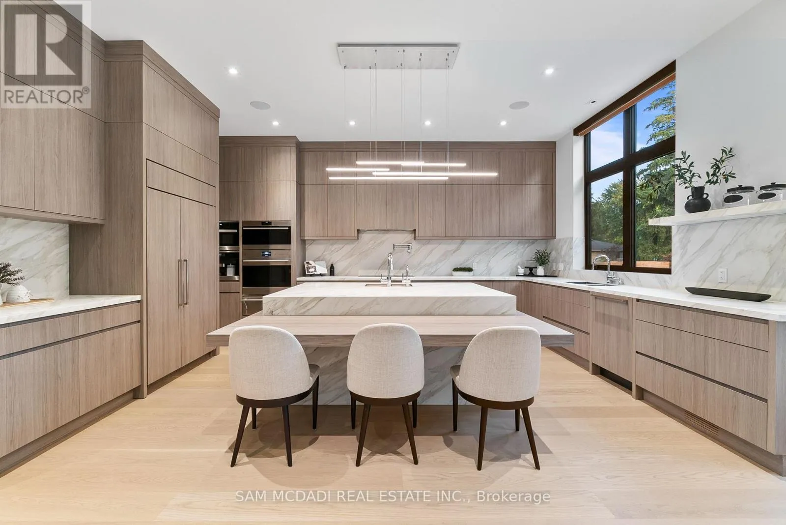 +"PublicRemarks": "Introducing quiet luxury in this meticulously curated Lorne Park residence, crafted by renowned architect David Small. This modern masterpiece embodies refined sophistication, defined by clean lines, layered natural finishes & showcases exceptional quality & a lifestyle designed for entertaining, wellness, & effortless family living. Spanning an approx. 7000 SF, the home welcomes you with a dramatic two-storey foyer, anchored by a striking 23-foot Neolith feature wall, setting the tone for the architectural elegance that unfolds throughout the space.Open living & dining rooms lined with builtin servery, glass display cabinetry, & ceiling speakers create an elegant entertainment hub. Family room with Regency fireplace & integrated storage. Powder room with floating vanity.The chefs kitchen is a sleek culinary haven: SubZero 48 panelled fridge & Freezer, Wolf induction cooktop, dual Wolf ovens (convection + steam), warming drawer, panelled Miele dishwasher, coffee machine, microwave, & Insinkerator disposal with instant-hot & pot-filler faucets. Modern chandelier, under-cabinet & base strip lighting, & dual sinks (large single + double) complete the kitchen.Master suite boasts a 12.6ft ceiling, cove lighting, walk-in closet with builtin safe, & electronic lock for privacy. Spacious master ensuite offers steam shower with pressure massager, rain & hand showers, dual vanities, floor heating, & soaking tub.Three additional bedrooms all with ensuites & closets; one features a private balcony overlooking the front yard. The walkout basement is flooded w/ natural light, floor heating, ceiling speakers, & another fireplace. Bar room & spa room offer complete relaxation: saunaCore infrared + traditional sauna, steam room with massage/rain showers, changing area, storage, spa vanity, mirrored gym w/ antislip flooring, glass wall, & TV mount. Guest room with ensuite & heated floors, organized mechanical room, snowmelt driveway, new fence, limestone, stucco & neolith exterior. (id:62650)"