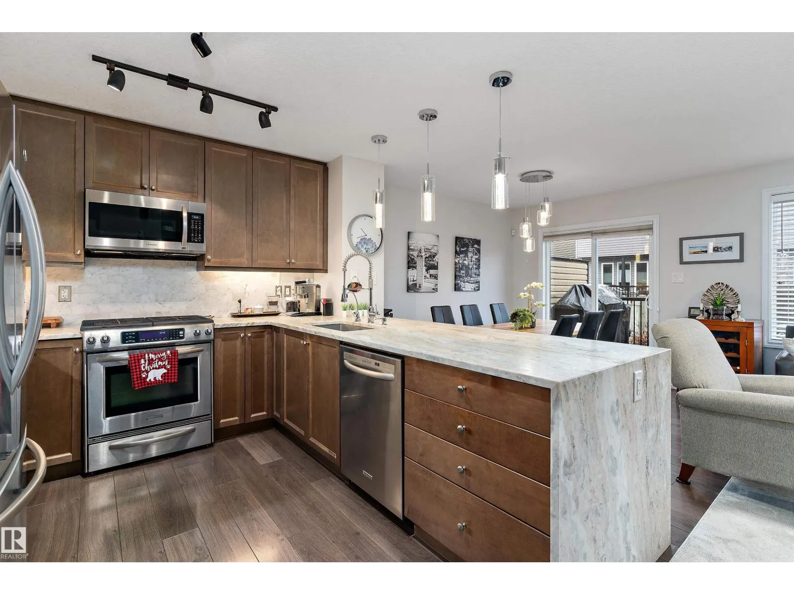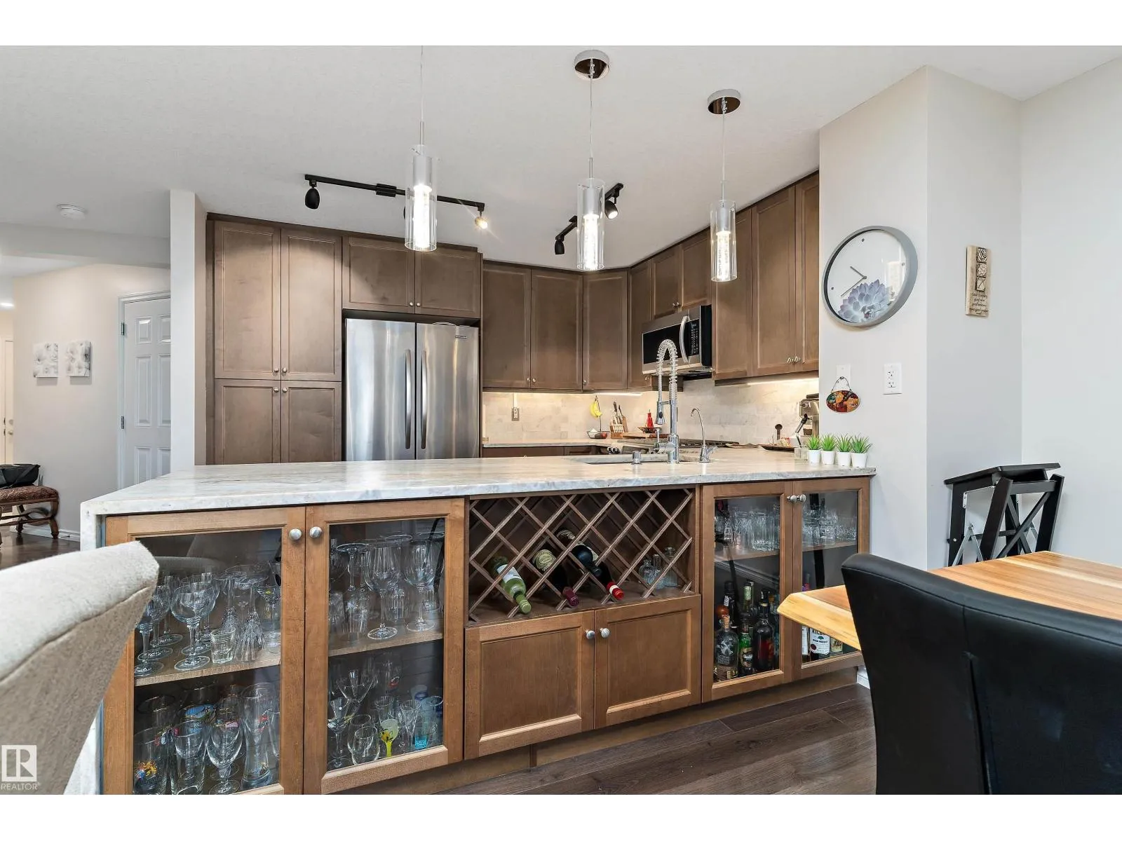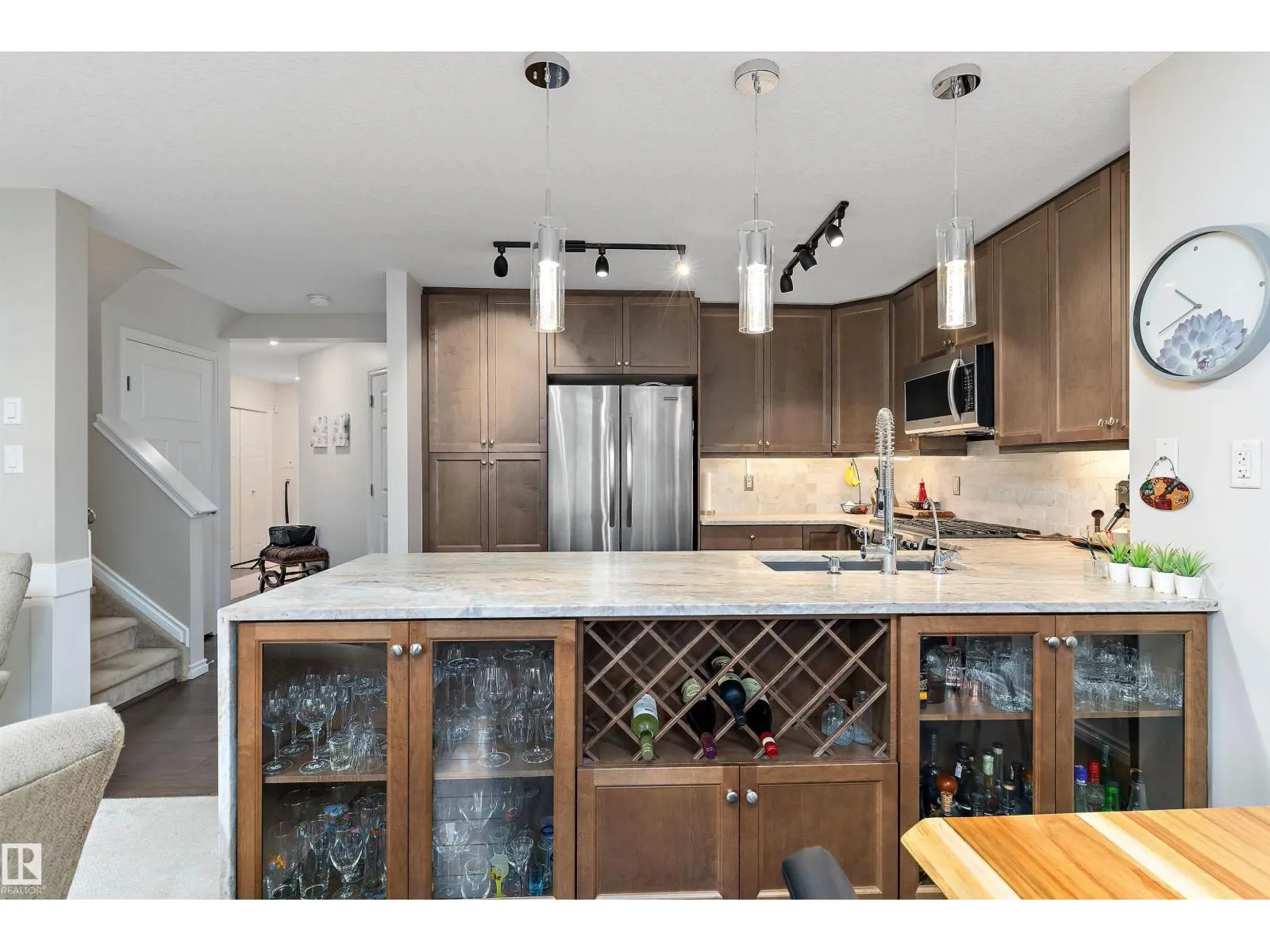 +"PublicRemarks": "Stylish, updated, and move-in ready! This air-conditioned South Terwillegar home is loaded with upgrades: new marble countertops, updated lighting, wainscoting, gas fireplace, and a spacious kitchen with stainless steel appliances, great storage, and a built-in wine rack. Upstairs features a bonus room and two impressive primary suites - one with a 5-piece ensuite and the other with a 4-piece - offering exceptional flexibility and privacy. The fully finished basement adds a recreation room, wet bar, and 3-piece bath. Outdoors, enjoy low-maintenance living with artificial grass front and back, a new front door, and a composite deck perfect for entertaining. A double attached garage and extra-wide driveway complete this standout home. Don't miss this opportunity! (id:62650)"