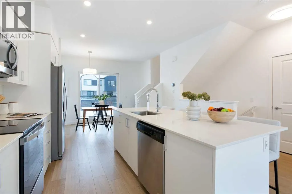 +"PublicRemarks": "*** OPEN HOUSE SATURDAY JANUARY 10TH: 1:00 PM 4:00 PM *** Step into a world where sophistication seamlessly meets everyday comfort in this remarkable contemporary townhome. Boasting over 1,634 sqft spread across three impeccably designed levels, this residence features three spacious bedrooms and two and a half bathrooms, offering an environment of refined, turn-key living. The moment you enter the welcoming foyer, you are greeted by a beautiful main floor living room, bathed in an abundance of natural light. This ground floor ensures ultimate functionality, featuring a generously sized coat closet, utility room, and a practical mudroom that provides direct, access to your convenient double attached garage. Upstairs, discover the heart of the home - a bright and open haven for both daily life and entertaining. The family room provides an idyllic setting and offers a bright and inviting ambience. The stunning, modern kitchen showcases sleek countertops, ample cabinetry, and is anchored by a large center island that provides comfortable seating for four. This culinary space flows effortlessly into the generously sized dining room. Extending your living space outdoors is a sunny balcony located just off the dining area—the perfect spot for enjoying your morning coffee or hosting summer evening gatherings. For the convenience of your guests, a stylish two-piece powder room completes this impressive main entertaining level. The private upper level is dedicated to peaceful relaxation. The flooring transitions to plush carpeting, creating a tranquil environment for the three spacious bedrooms. The primary suite is a true retreat, featuring a private three-piece ensuite and a dedicated walk-in closet. The two additional great-sized bedrooms, each with ample closet space, share a well-appointed four-piece main bathroom, plus an essential addition to this floor is the conveniently located upper-level laundry room. Beyond the elegant interior, this home offers superb comfort a nd convenience, including central air conditioning, parking for 4, plus a storage room within the garage. Designed for those who value style, comfort, and unparalleled convenience, this home checks all the boxes. Set in Belvedere—one of Calgary’s most exciting and fast-growing neighborhoods, you are placed moments from everything you need. Whether you’re a first-time buyer, growing family, or investor, this property is a must-see so book your showing today! (id:62650)"