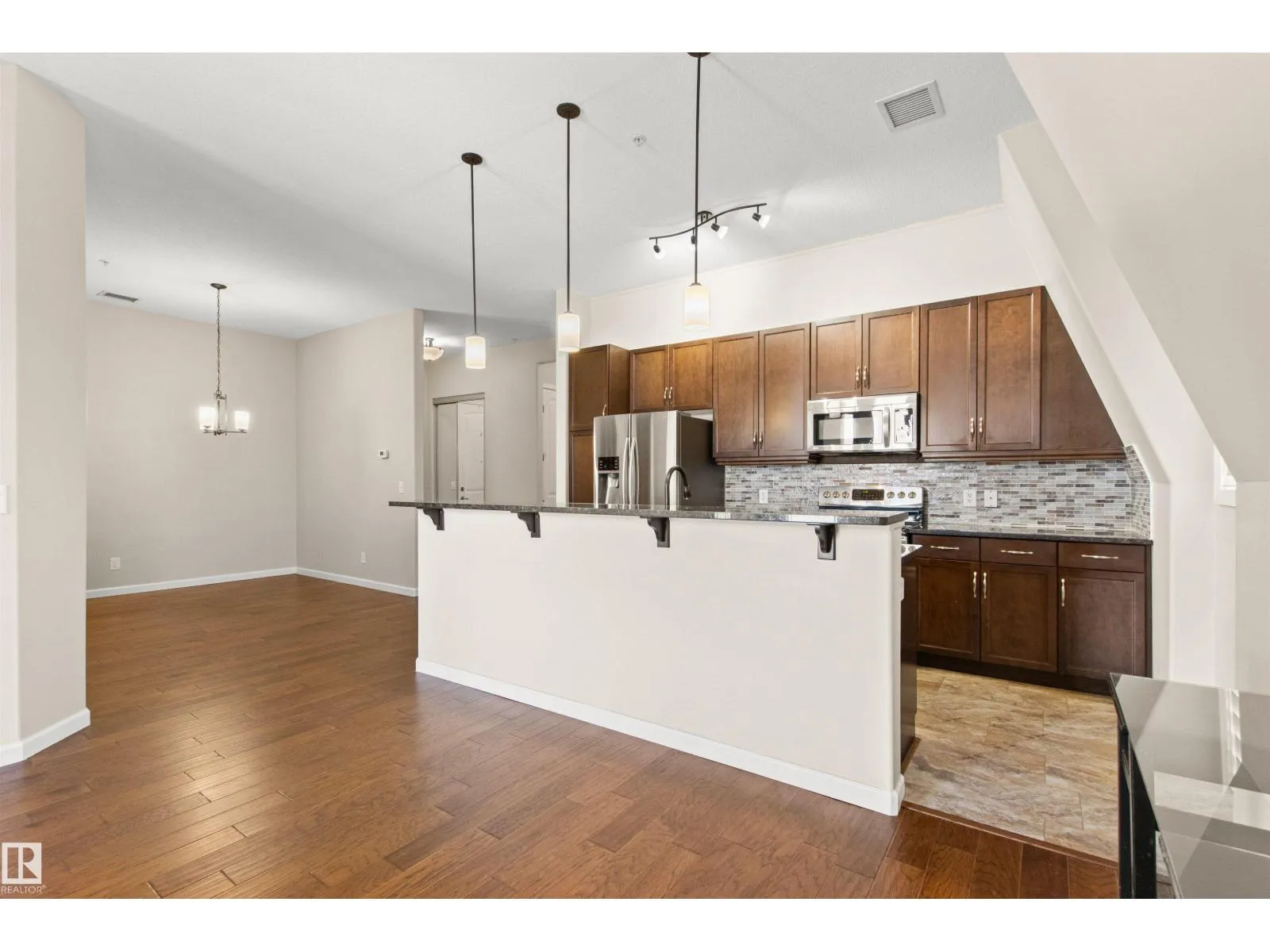 +"PublicRemarks": "Rare opportunity to own this penthouse corner end unit with spectacular views off the balcony overlooking 2 lakes, landscaped trees, & walking trails! This 2 bedroom + den open concept layout features; chefs galley kitchen, cherry stained mahogany cabinets, granite counter tops, s/s appliances, impressive 10' vaulted ceilings, engineered hickory hardwood, custom built-in murphy bed, den has built-in book shelf unit, ensuite off primary bed. has huge shower w/his & hers closets, in-suite laundry, spacious living rm w/corner mantle fireplace, formal dining rm., patio drs. lead to one of two covered private decks. A truly remarkable gem in Mactaggarts exclusive neighborhood. Best of all its an original owner & yes in showhome condition! Complete with two heated underground stalls, one storage cage, two gyms, social rms., & Guest Suites! Just minutes to Windemere, South Edmonton Common & Anthony Henday. (id:62783)"