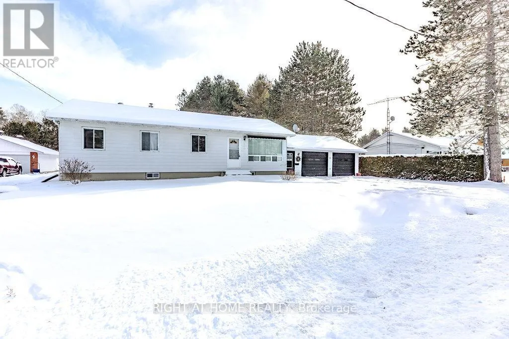 FOUR bedroom bungalow with large double garage (32′ by 28′) on a spacious flat lot in desireable Sandhill Subdivision in Barry’s Bay. Garage roof 2025, house roof 2017. Hot water tank owned. Water source is good dug WELL but town water runs in front of home if you want to change that. All appliances included. 100 AMP hydro. Multiple internet