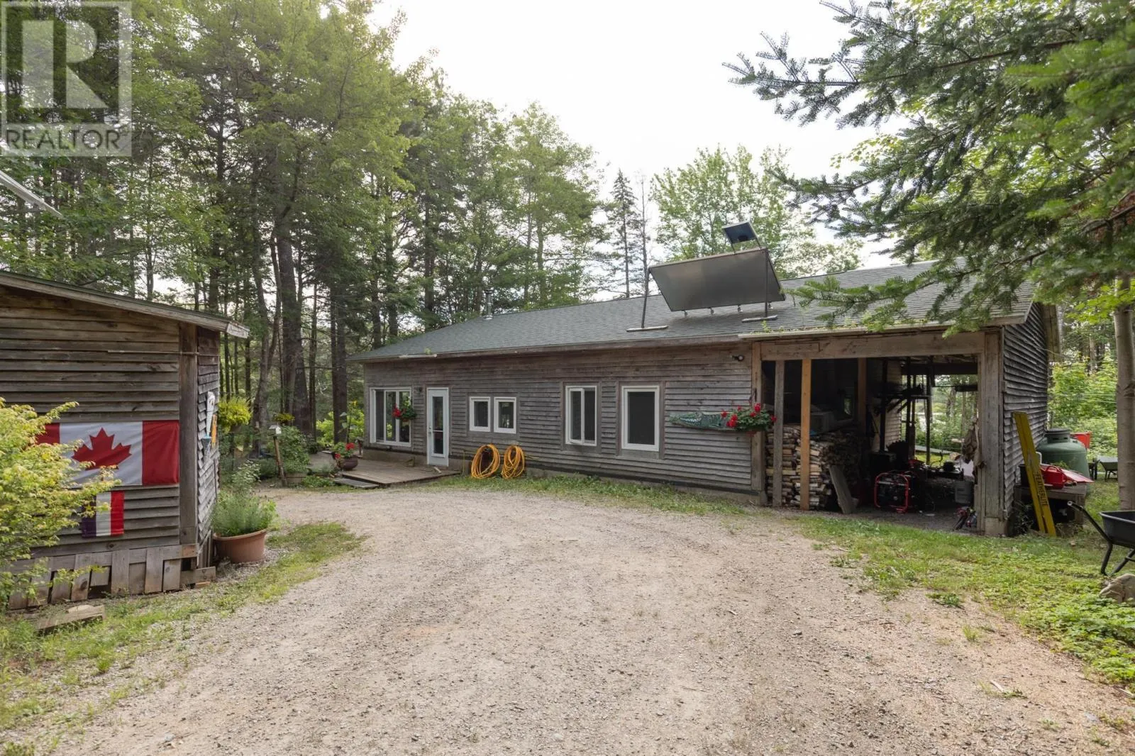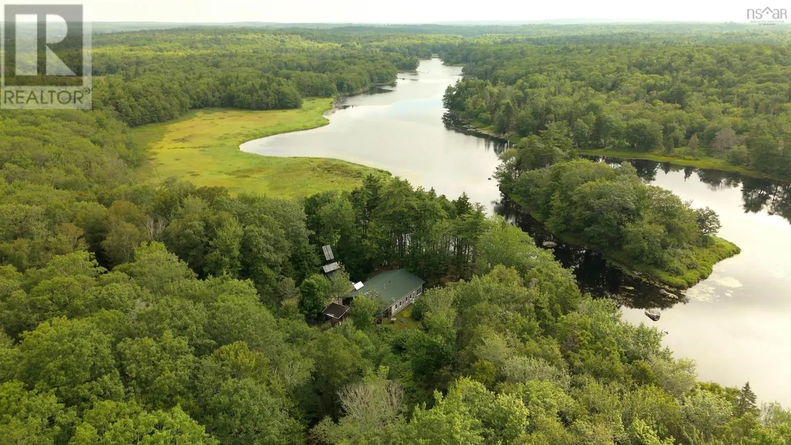 Southwest Nova Scotia has some unique properties. 1542 Canaan Road – only 20 minutes from the Town of Yarmouth – is one of them. This one-level 1280 sq.ft. home on 66 acres of forest on the beautiful Tusket River is a private setting with engaging seasonal views. A full solar system with a generator for backup supports off-grid living. This