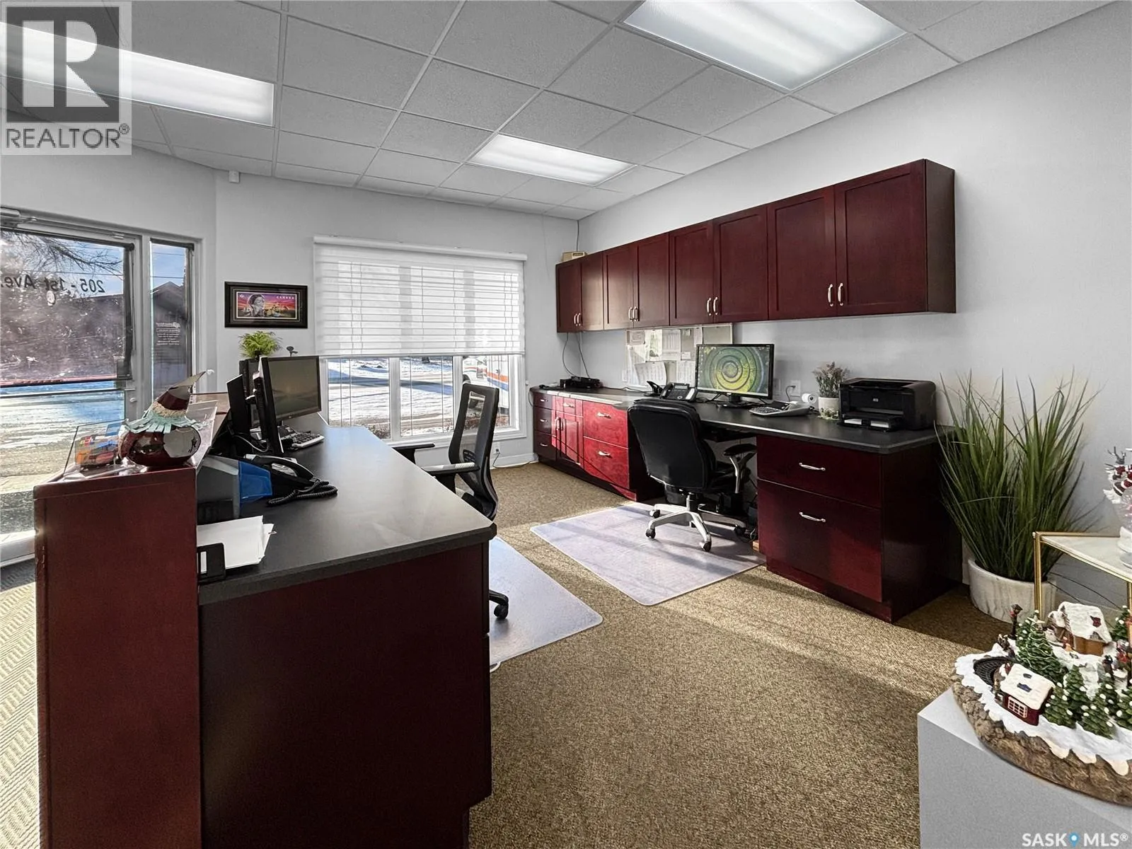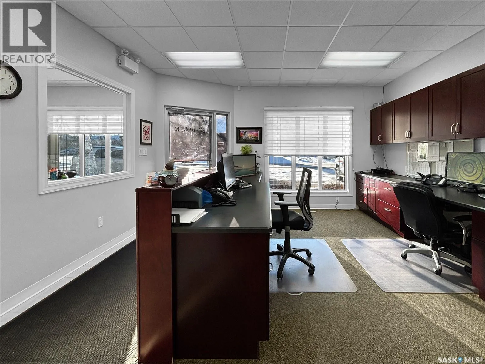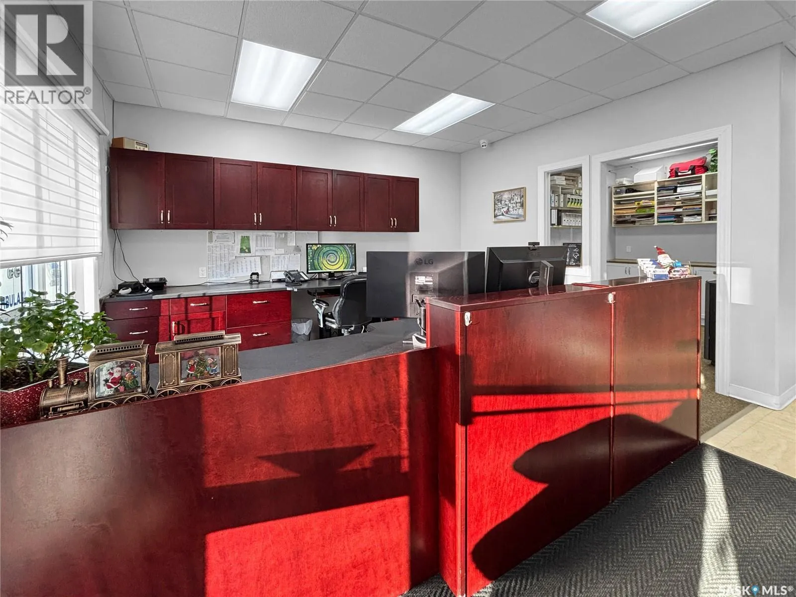 Prime commercial exposure – with approx. 3,500 sq ft, this building was built in 2007 and features a bright reception area, 2 private office areas, file storage room, 2 bathrooms, kitchen area, a conference room and a storage room. 3 garage bays are complete with drains and pit, in floor heat, bathroom with single shower stall, 2 storage rooms, a