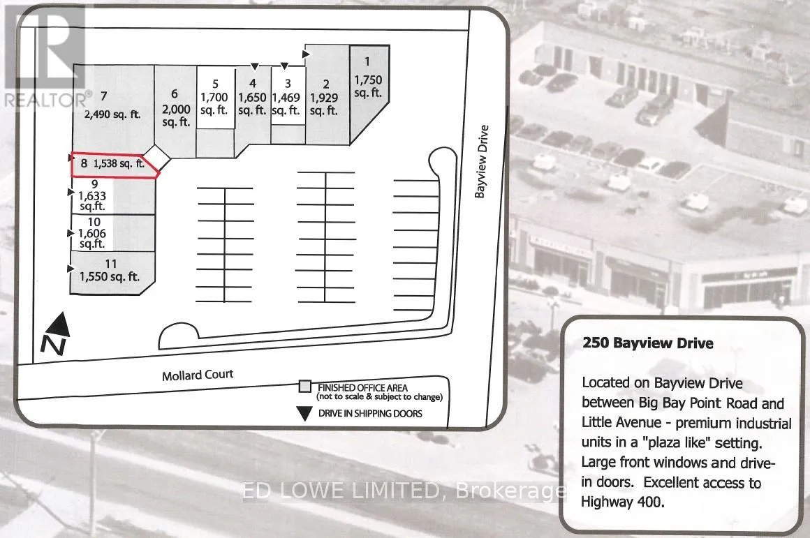 Well-located 1,538 sq. ft. industrial space with excellent exposure on high-traffic Bayview Drive in Barrie’s south end. This unit offers convenient access to Highway 400 and is surrounded by restaurants, shopping, and a nearby recreational centre. Features include one drive-in door, ample on-site parking, and strong street visibility ideal for a variety of industrial or service-oriented uses. Annual rent escalations