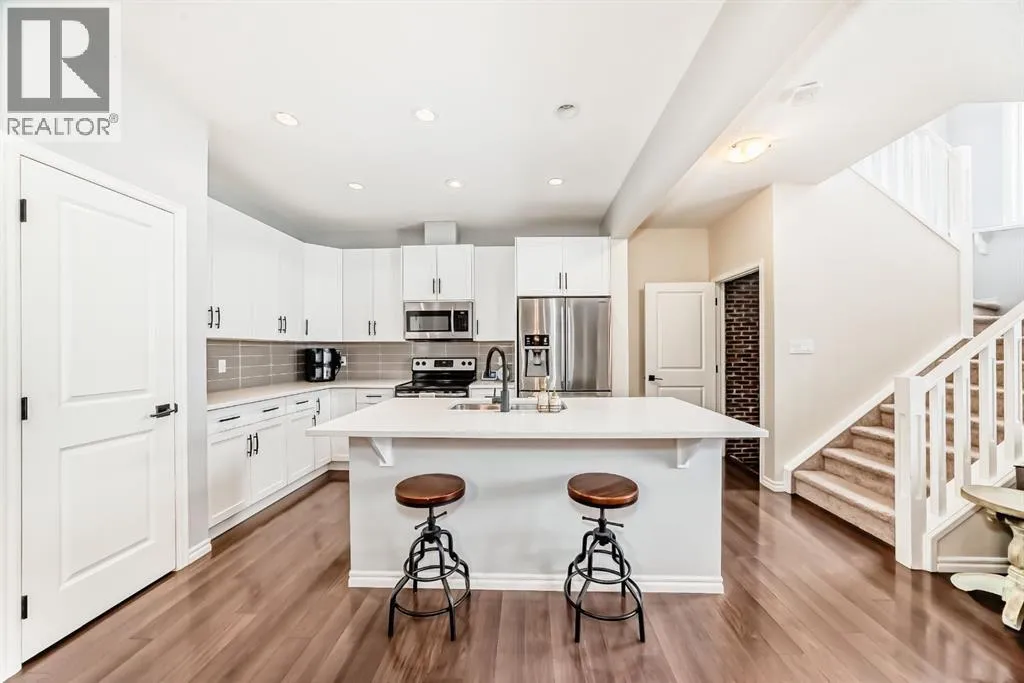 +"PublicRemarks": "Welcome to The Bennett floor plan crafted by a long-standing Alberta builder Sterling Homes, with over 70 years of experience, offering quality, comfort, and thoughtful design throughout located in the growing community of Southbow Landing.Southbow Landing is one of Cochrane’s newest and most convenient areas, with quick access to schools, groceries, restaurants, pathways, playgrounds, and the Bow River. Calgary commuters will appreciate the easy connection to Highway 1, while still enjoying the quiet, family-focused feel Cochrane is known for.Inside, the home features an open-to-above great room with large windows and a gas fireplace that fills the main floor with natural light. A versatile flex room with double French doors provides options for a home office, playroom, or hobby space. Luxury vinyl plank runs throughout the main level.The executive kitchen is a standout, designed with both style and function in mind. It features two-tone cabinetry with classic white shaker uppers and a charcoal island, paired with black hardware for a modern, cohesive look. A stylish tile backsplash adds texture and personality to the space. The kitchen is equipped with built-in Whirlpool appliances, including a sleek wall oven, built-in microwave, and a gas cooktop, along with a walk-in pantry for additional storage. The layout flows directly to the rear deck, making everyday living and entertaining effortless.Upstairs, every bedroom includes its own walk-in closet. The spacious primary suite features a 5-piece ensuite with a tiled walk-in shower and a relaxing soaker tub. Additional windows throughout the home enhance the bright, open feel.This home is Built Green certified with triple-pane windows, a high-efficiency furnace, an electric car charger rough-in, and a solar chase for future-ready living. Smart home features include a programmable thermostat, Ring doorbell camera, smart lock, smart switches, and an Amazon Alexa touchscreen hub.A well-designed, energy-effi cient home in a fantastic location. This quick possession home is ready for its first owners. Photos are representative and exterior photo is artist rendering. (id:62650)"
