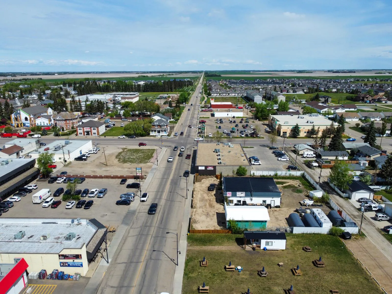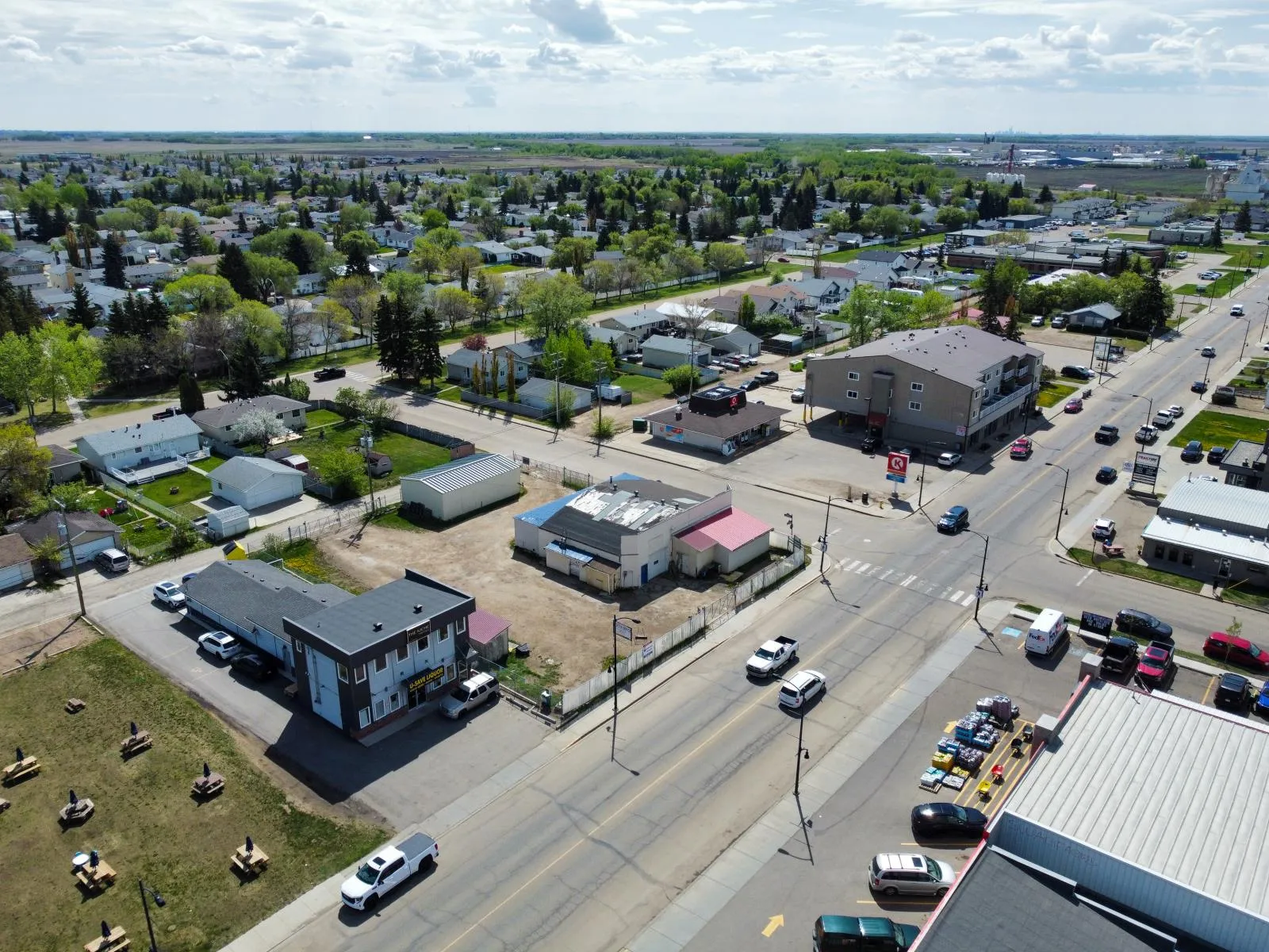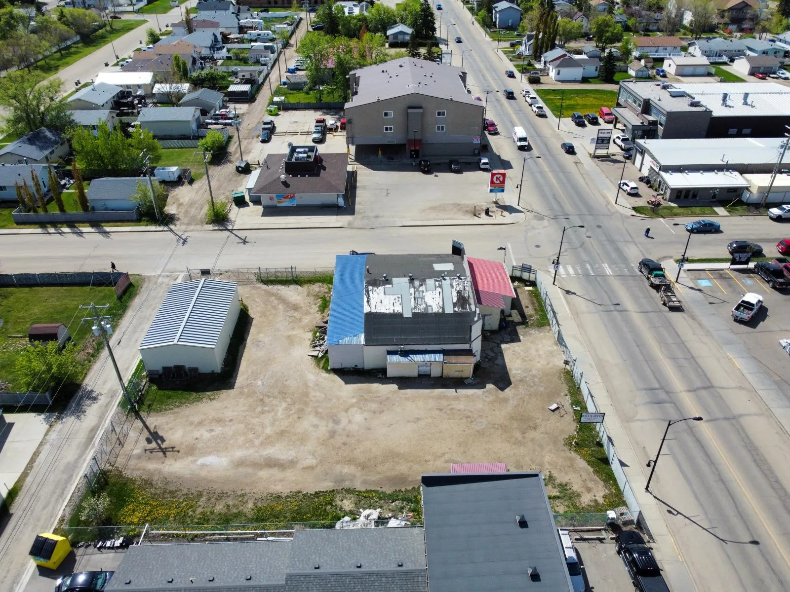 Prime Commercial Property for Sale in Morinville. A unique opportunity to acquire a high-visibility commercial property located on the bustling Main Street of Morinville. This former bottle depot sits on a strategically positioned corner lot with excellent exposure, benefiting from over 5,265 vehicles passing daily. The expansive lot spans 150’ x 127’, offering ample space for redevelopment potential. With dual